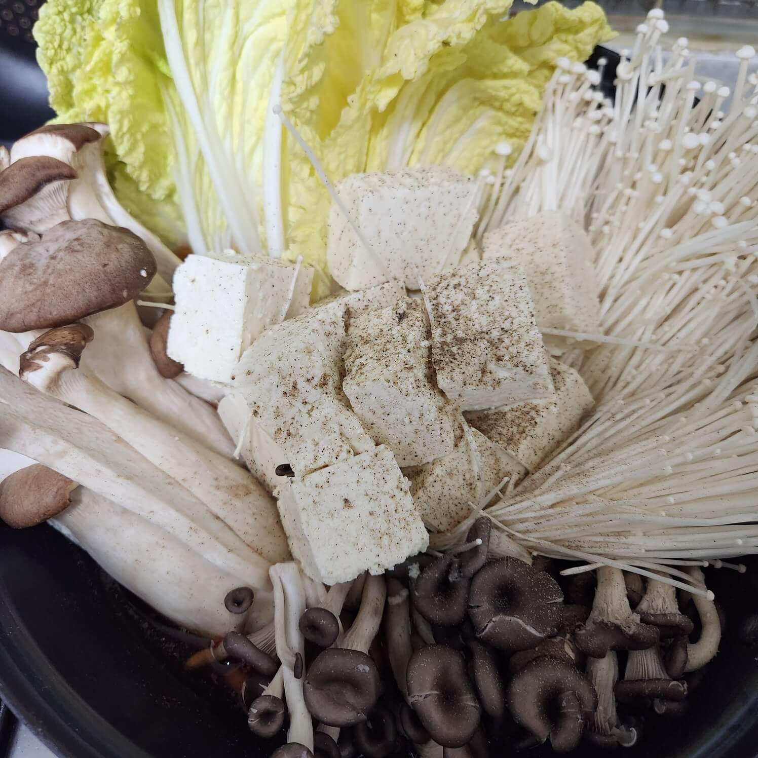 4. 전골냄비에 버섯과 배추, 두부를 모두 넣어준 상태에서 후추를 대략 20번 정도 뿌려주시면 돼요.