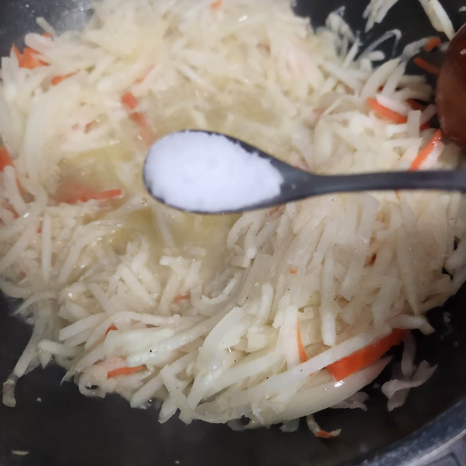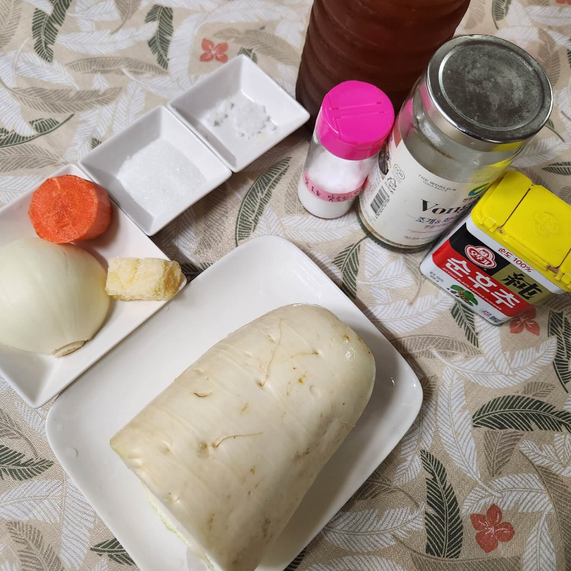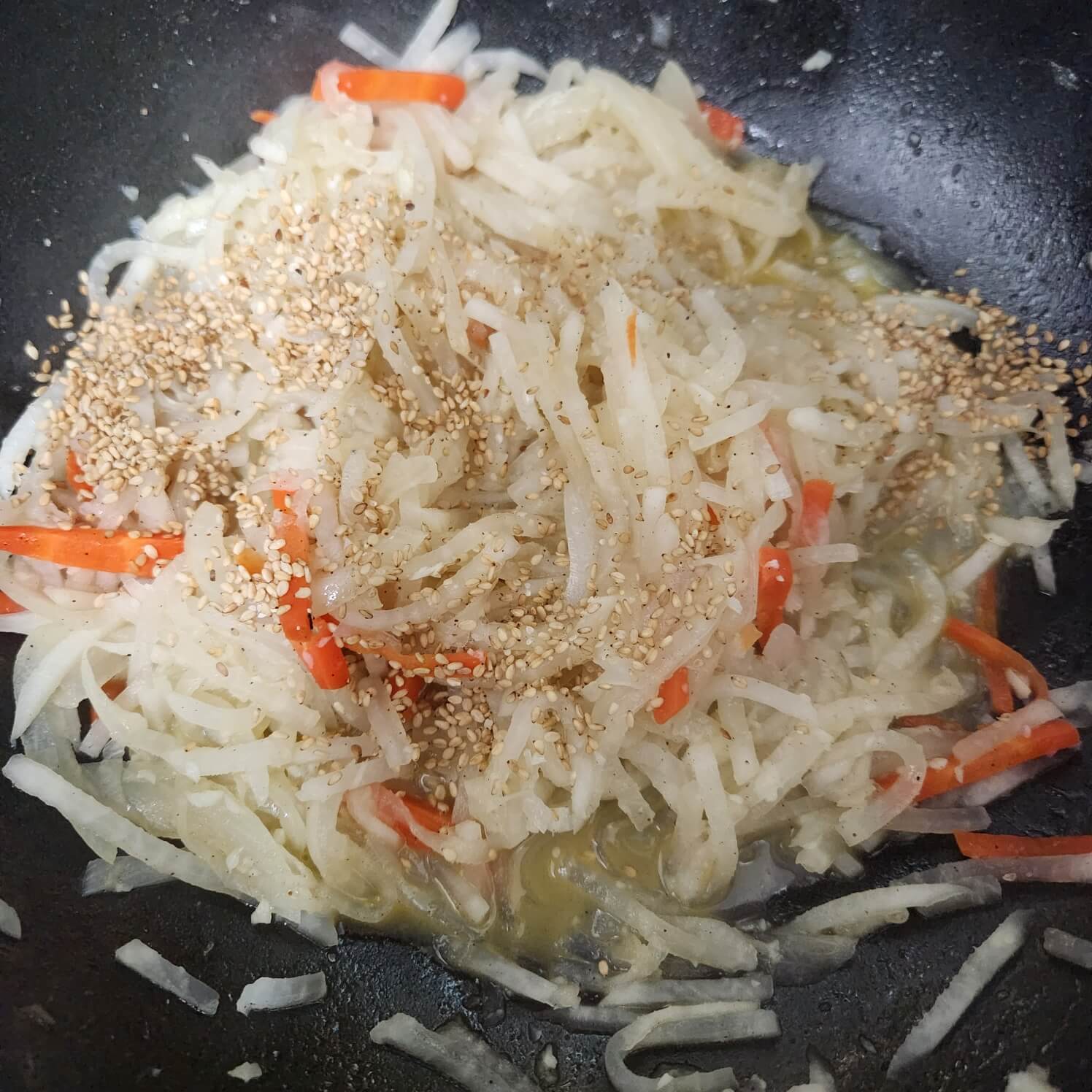 - 무, 당근 1/6 개, 양파 반개, 다진 마늘, 후추, 통깨, 들기름, 소금, 설탕