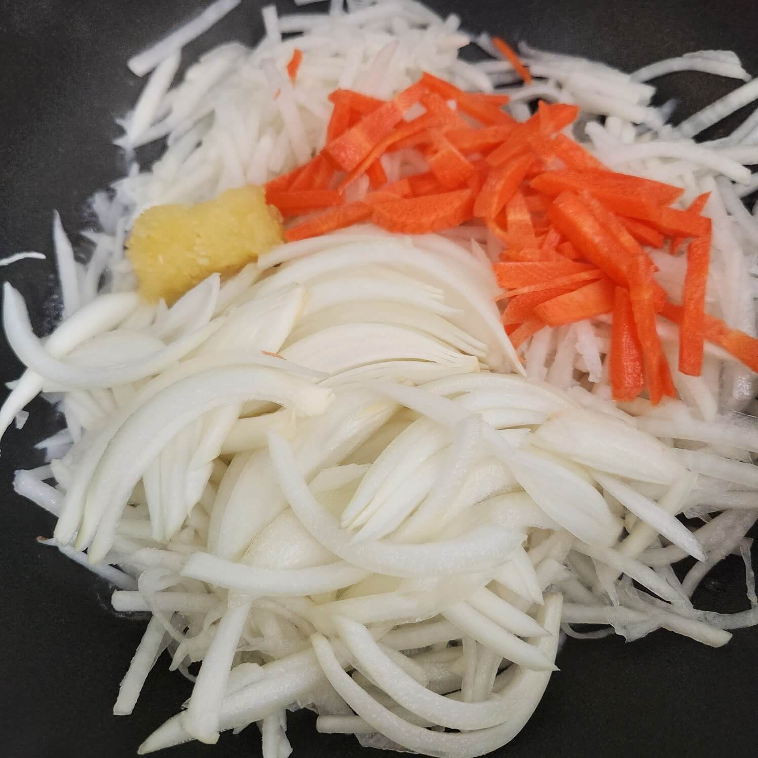 3. 팬에 무생채, 양파, 당근 채 썬 것, 다진 마늘 1을 넣고 센 불로 볶아주시다가 뚜껑을 덮어주시면 돼요.