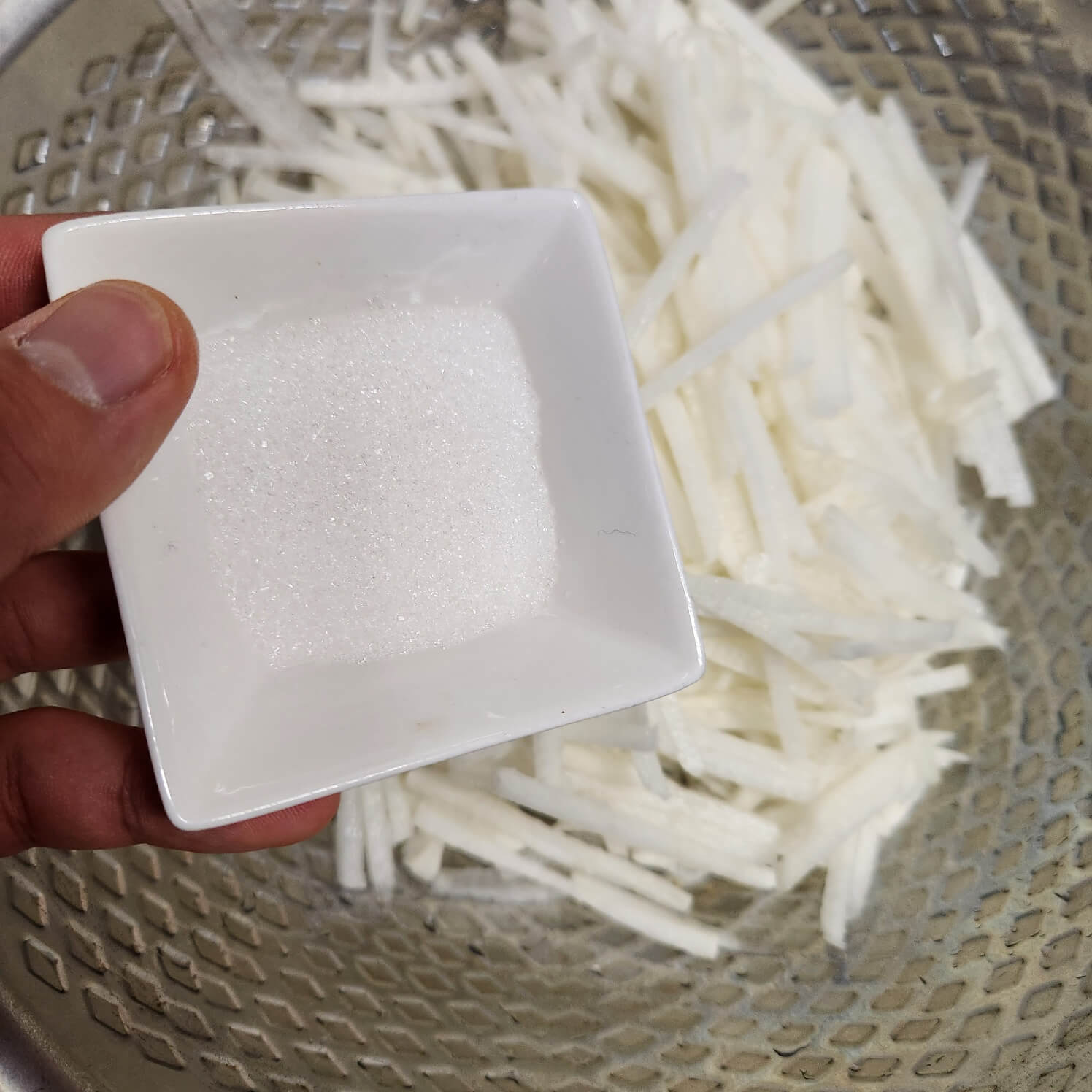 👉설탕 1, 소금 1을 넣고서 버무려주시면 무생채가 절여지는데 무에서 적당량의 수분이 많이 빠져요.