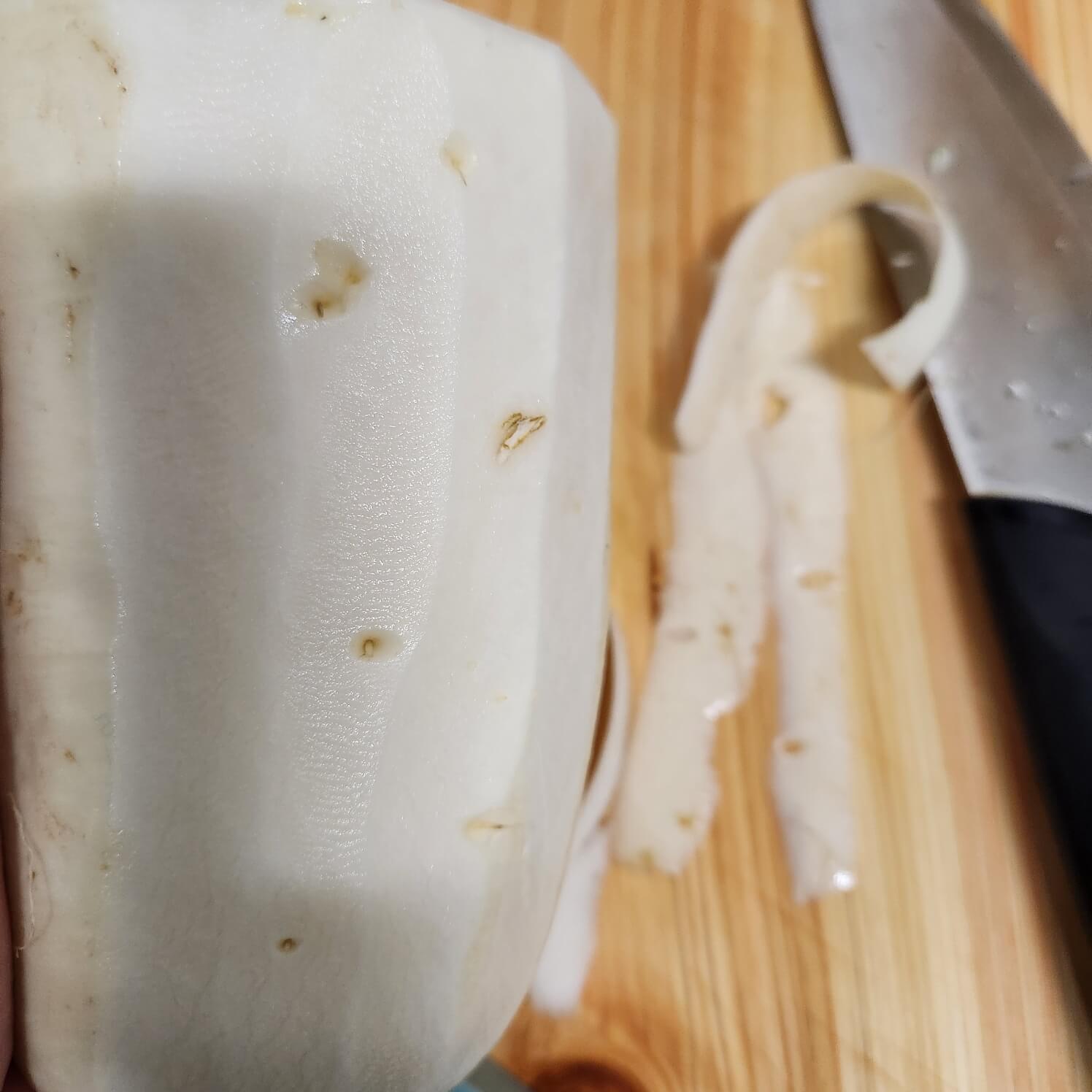 1. 무 껍질을 벗기고나서 채칼로 채 썰어주면 돼요.