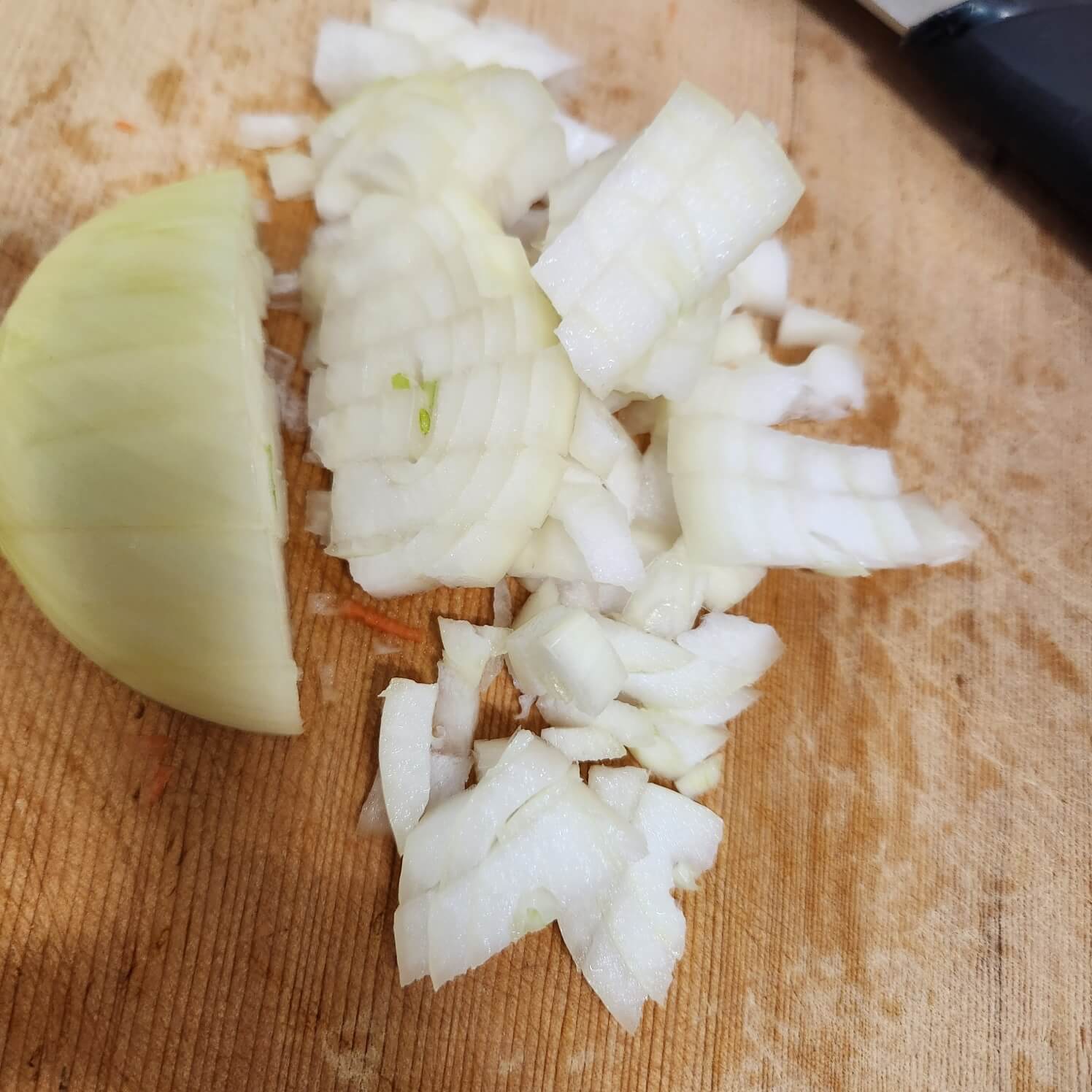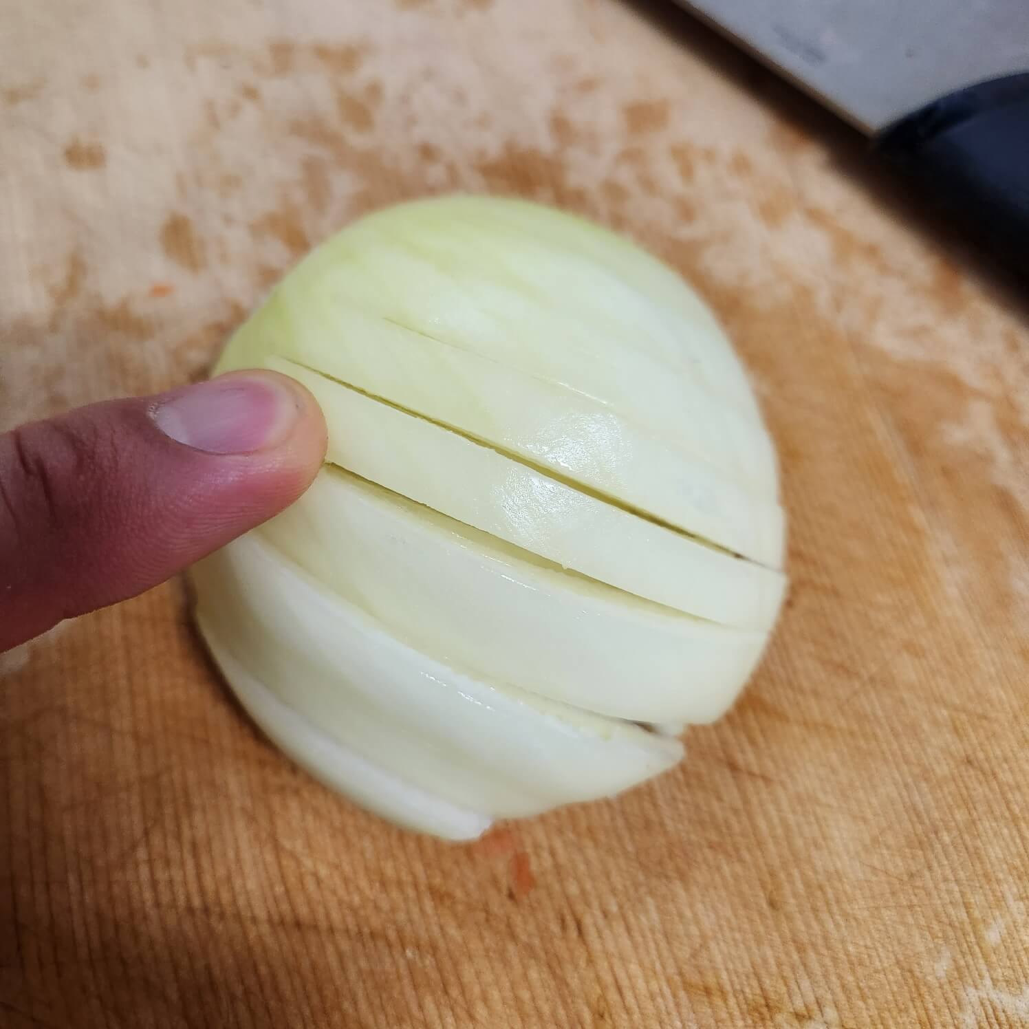 2. 양파는 반으로 갈라서 뿌리 부분 전 단계까지 칼집을 내주어서 잘라주시면 편하게 다질 수 있습니다.