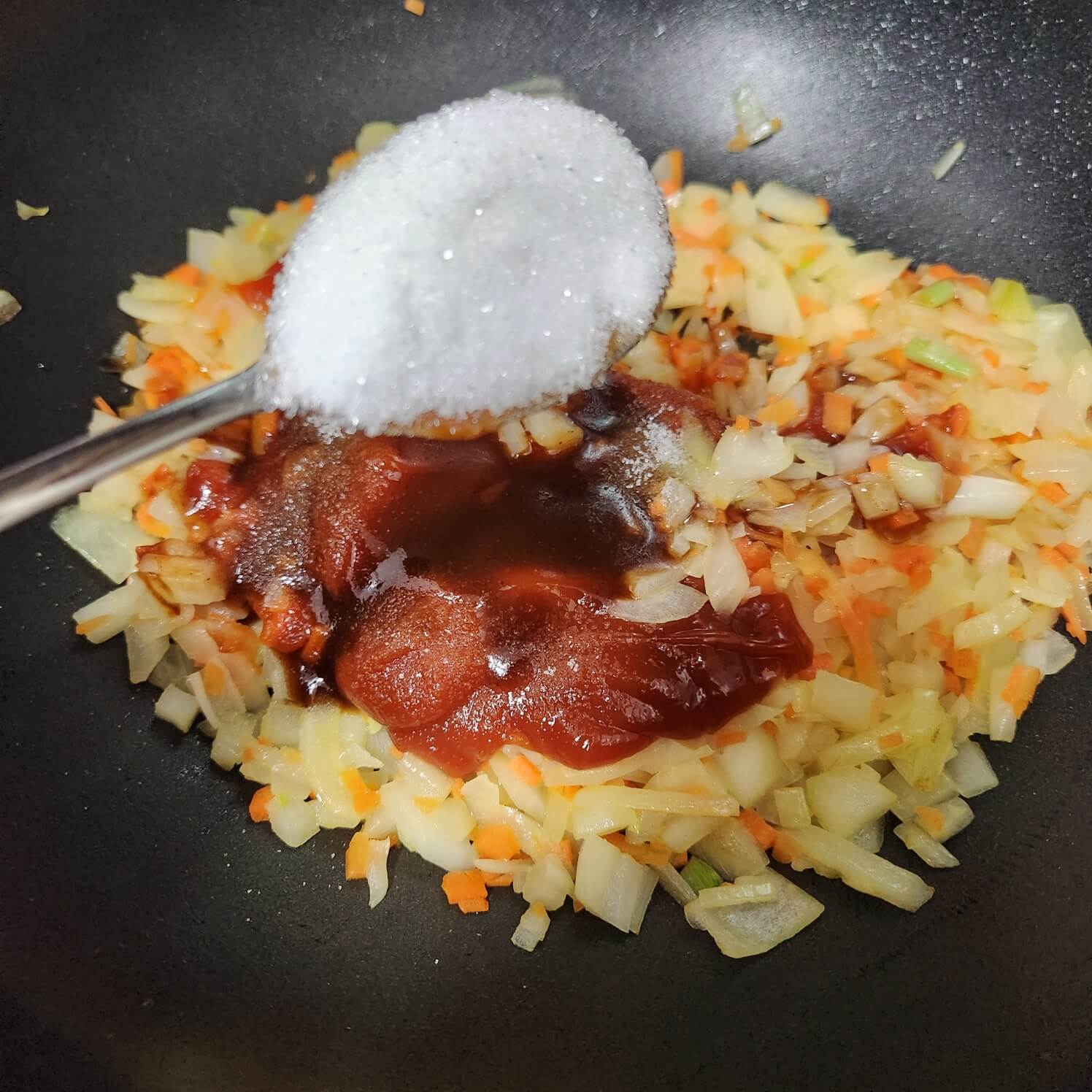 5. 약불에 케첩 4, 돈가스 5, 설탕 1을 넣고 잘 섞어주신 다음에 크림수프를 부어줄 거예요.
