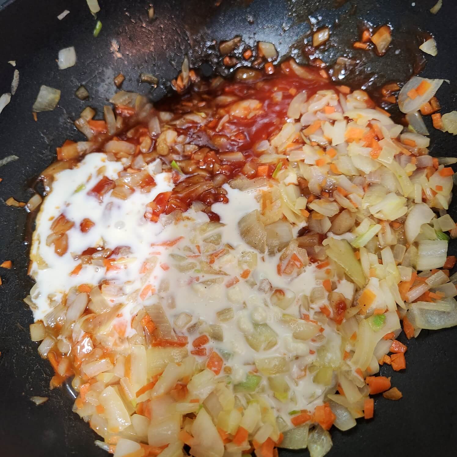 - 양파 2개, 버터 1숟가락, 당근 1/5개 (색깔용), 케첩, 돈가스 소스, 크림수프