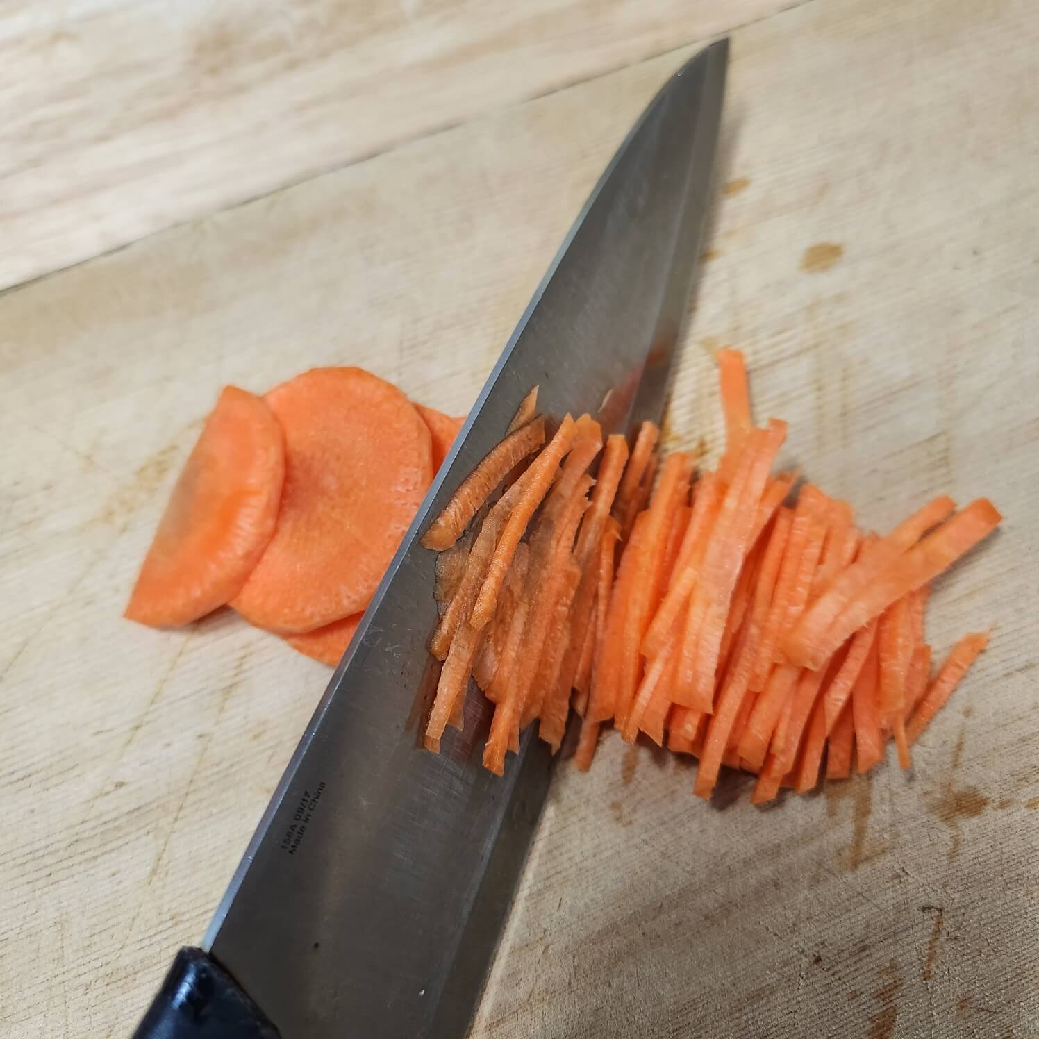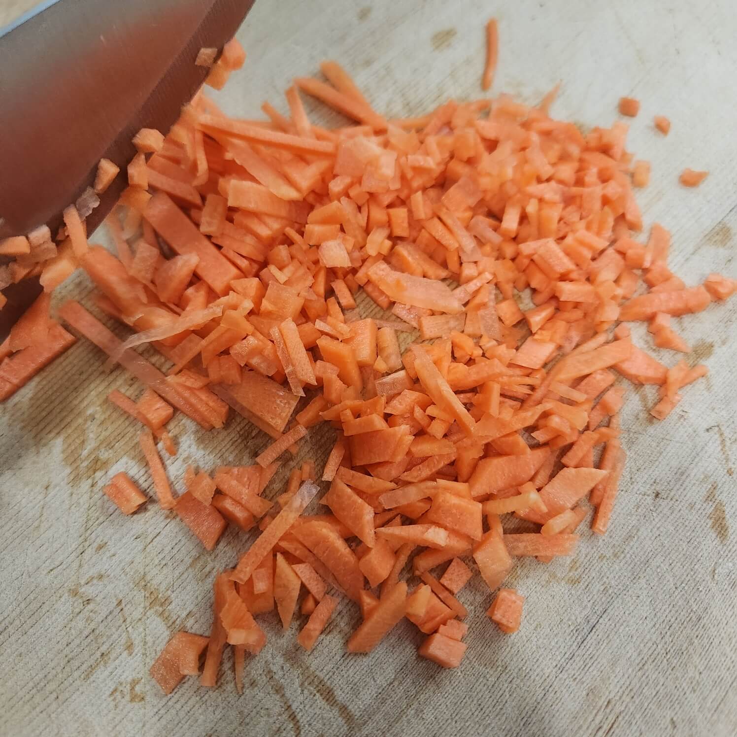 1. 당근은 원으로 잘라서 나란히 놓고 채 썰어주신 다음에 곱게 다져주시면 됩니다.