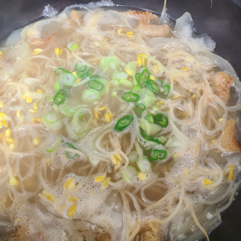 5. 콩나물이 숨이 죽으면 송송 썰기 한 파, 청야고추를 넣고 마무리해주시면 됩니다.