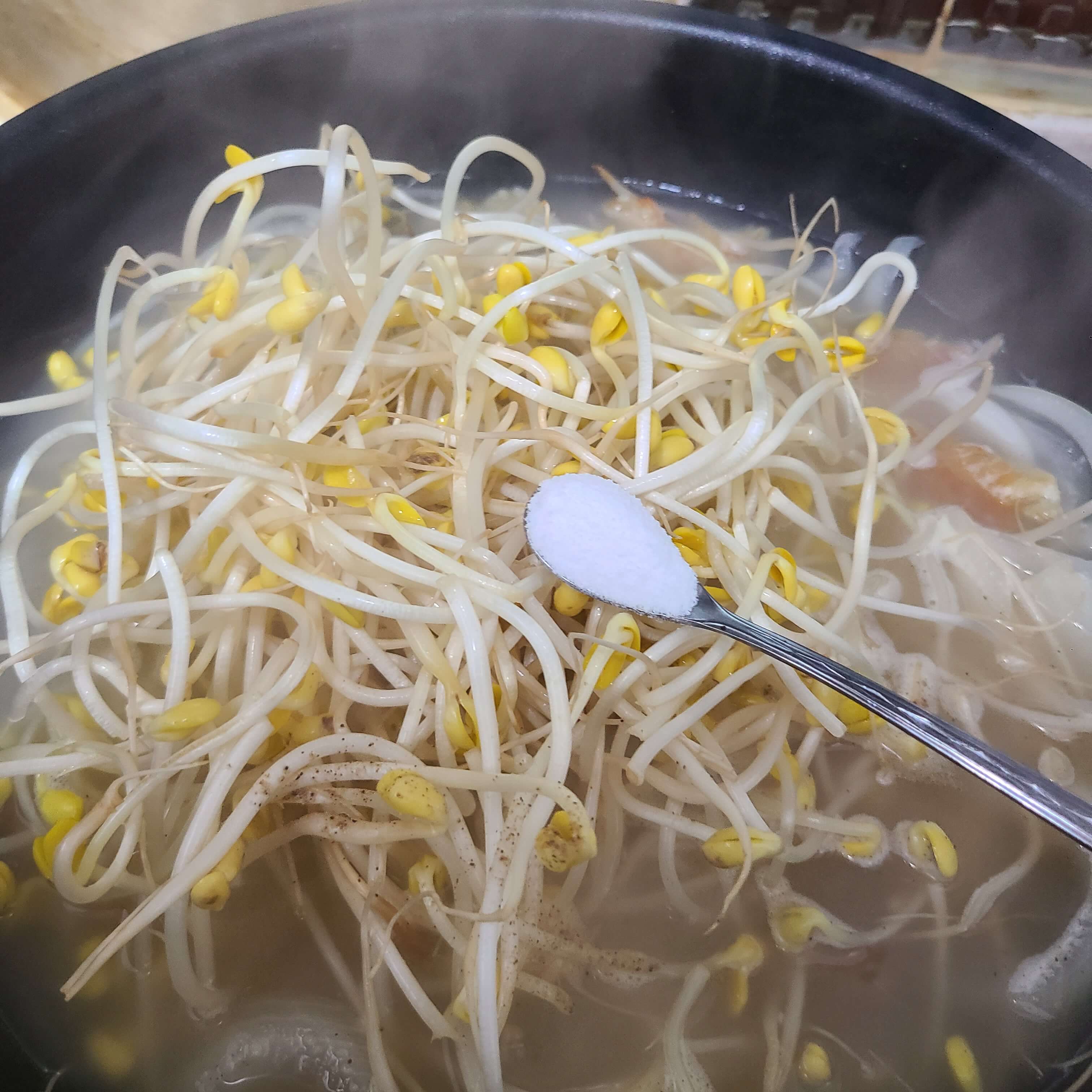 4. 끓는 육수에 콩나물을 넣고 나면 황태 콩나물 국을 간을 해주면 된다.