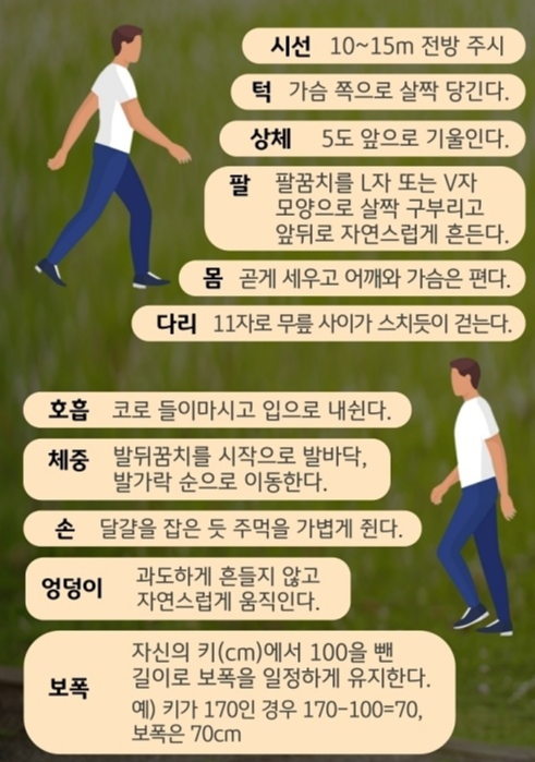 걸을 때는 배를 내밀지 말고 가슴을 앞으로 내밀어 체중이 약간 앞으로 쏠리는듯한 느낌으로 팔을 앞뒤로 가볍게 흔들어 주는 것이 올바른 자세입니다.