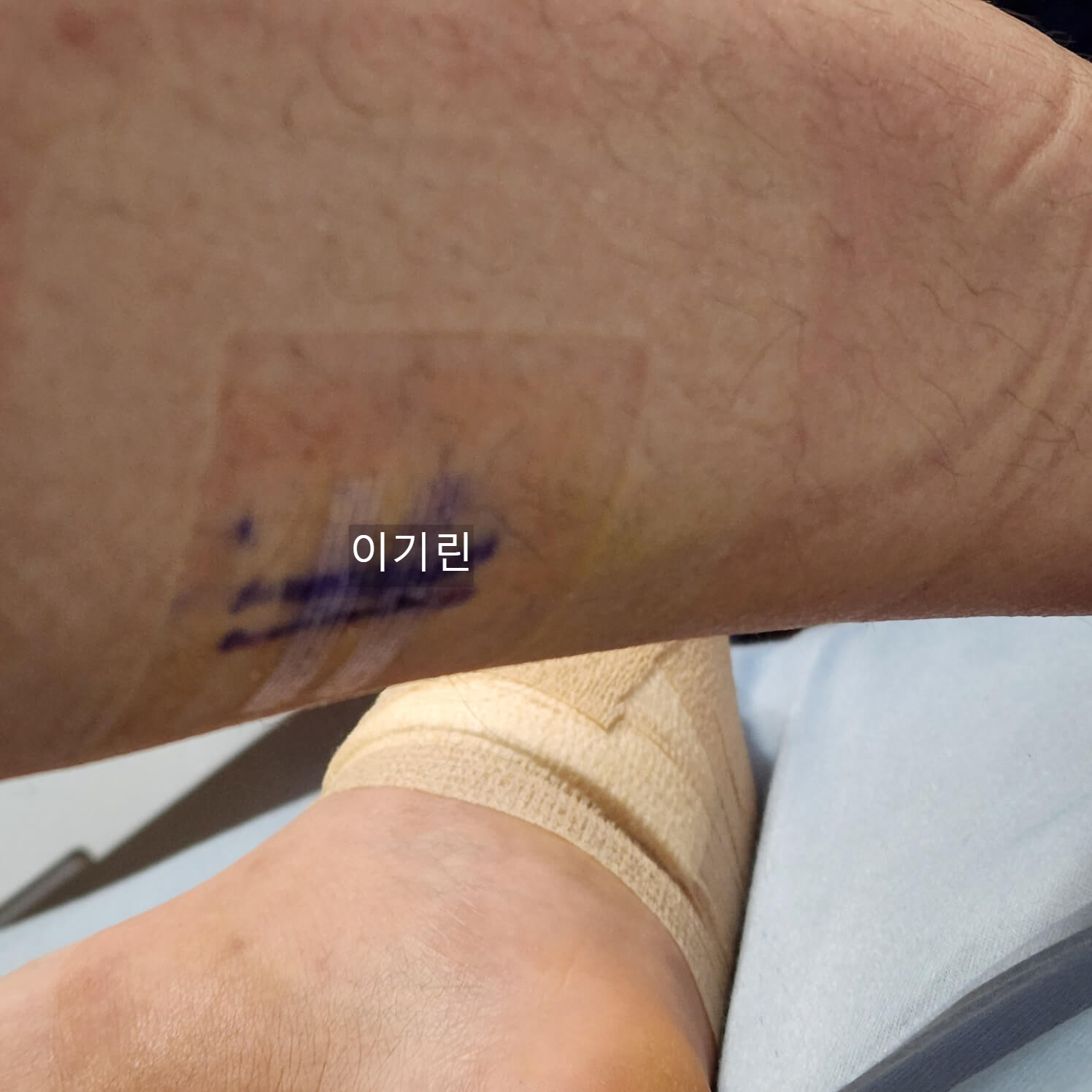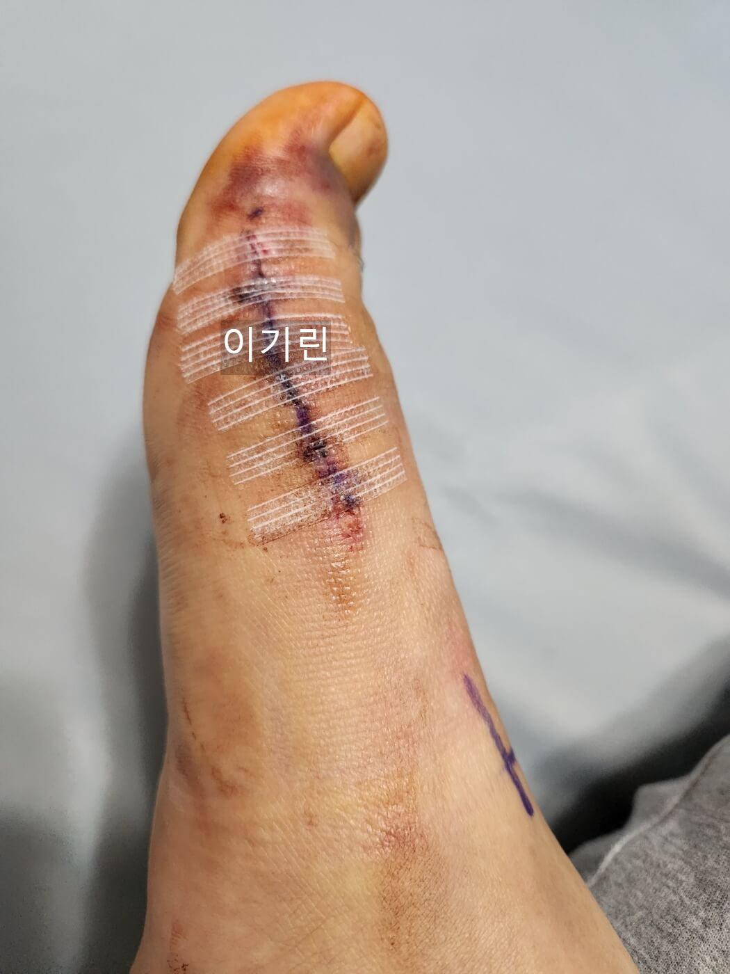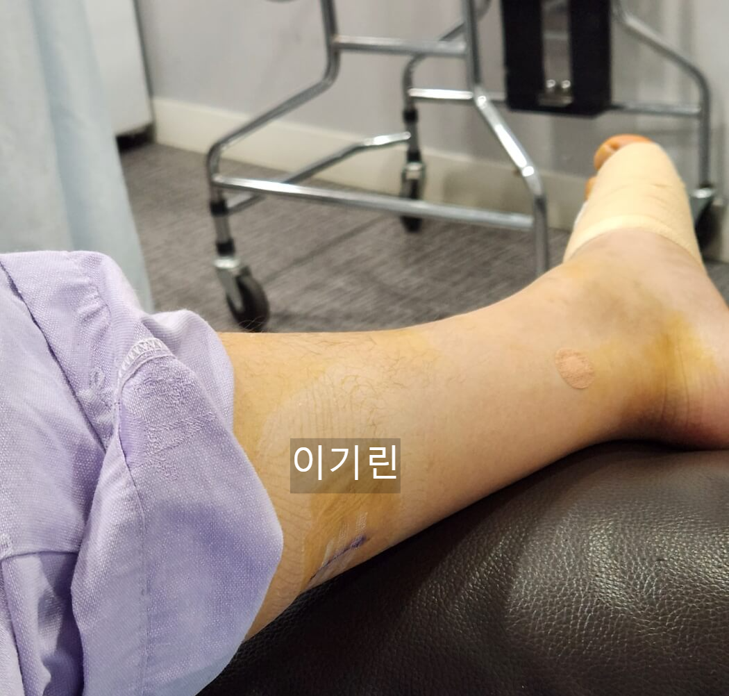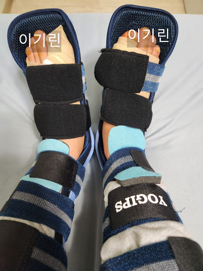 수술하고 나오면 위 의료기기 보조기구를 착용하고 나옵니다. 발가락 발톱 아직도 소독약이 묻어 있습니다. 수술 후 2주간은 샤워를 하지 못하니 참고하시면 좋을 것 같습니다.