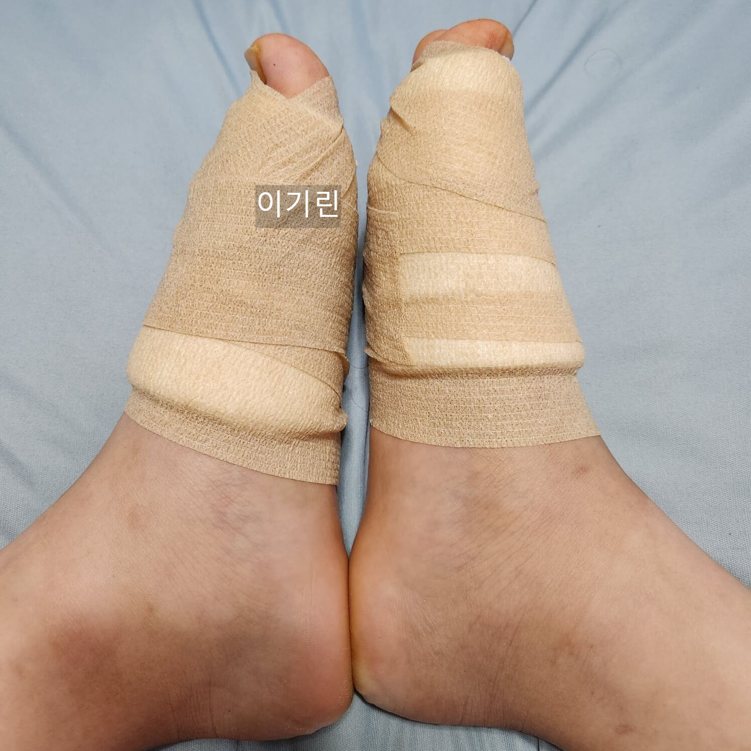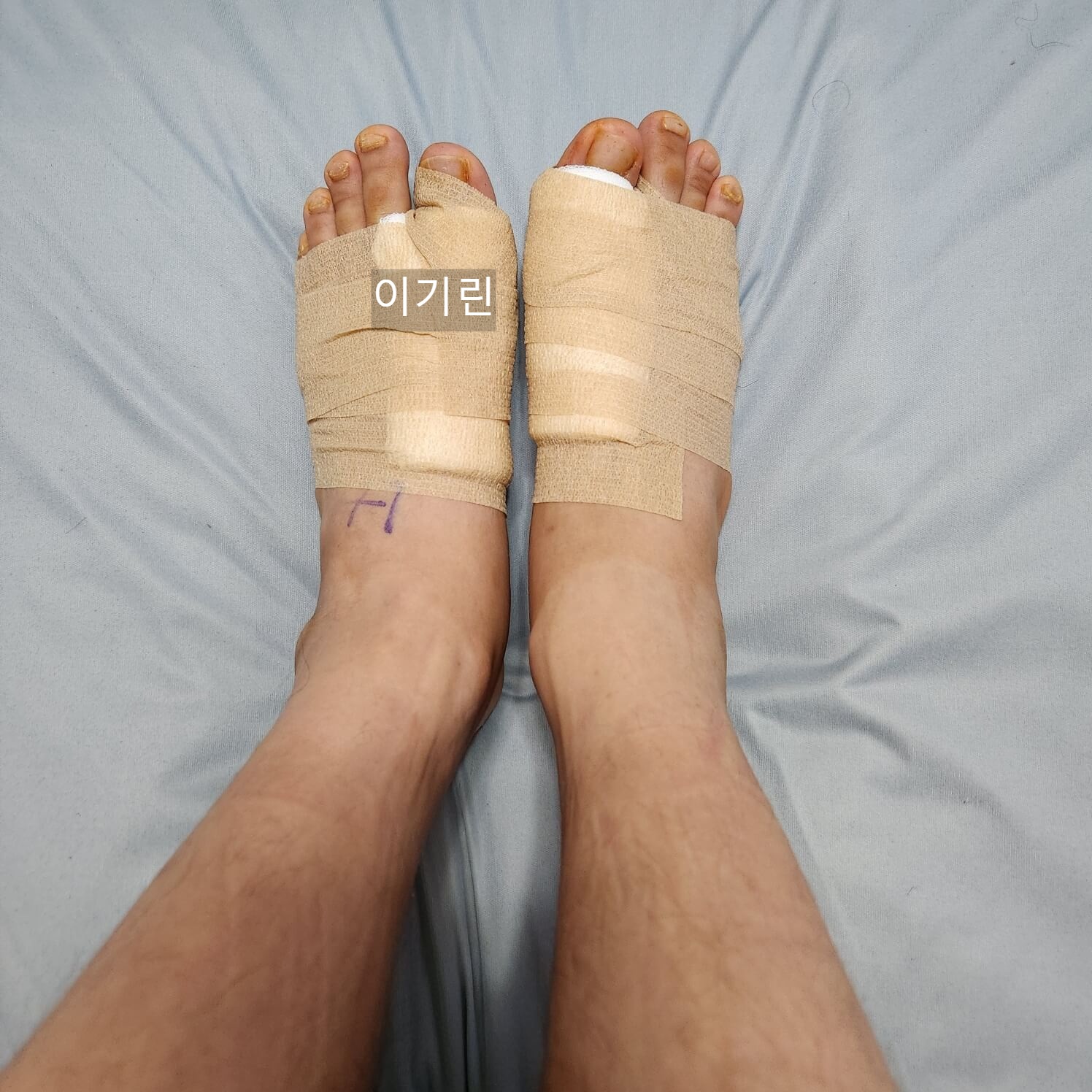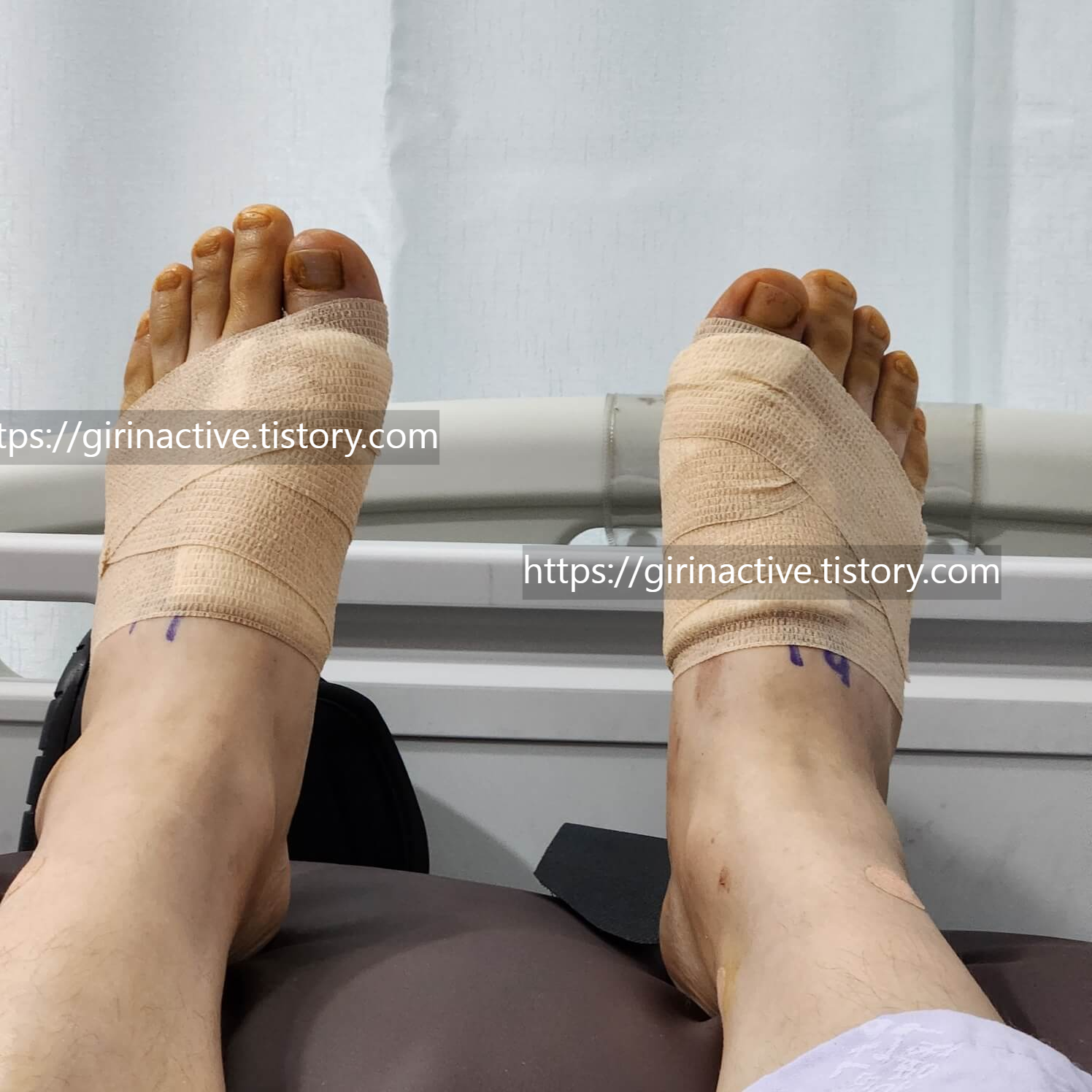 수술하고 2일 차 드레싱한 모습입니다. 20일 금요일 드레싱, 21일 토요일 드레싱 하고 퇴원했습니다. 양측 무지외반증 수술, 양측 비복근 수술로 아플 줄 알았지만 사실은 버틸만하게 아픈 정도였습니다.