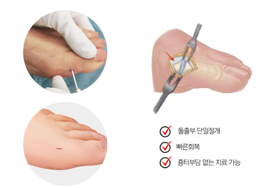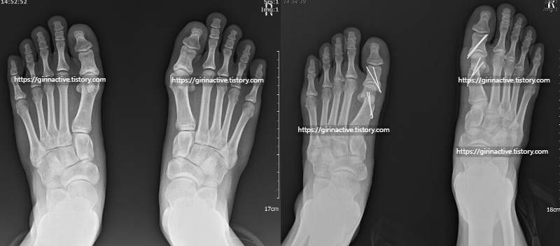 저는 왼쪽이 심한 상태가 아니고 오른쪽이 심한 상태였습니다. 육안으로 확인해도 엄지발가락 쪽인 왼쪽으로 많이 휘었고, 엄지발가락 밖에 부분은 뼈가 자라고 있는 부분을 제거했습니다.