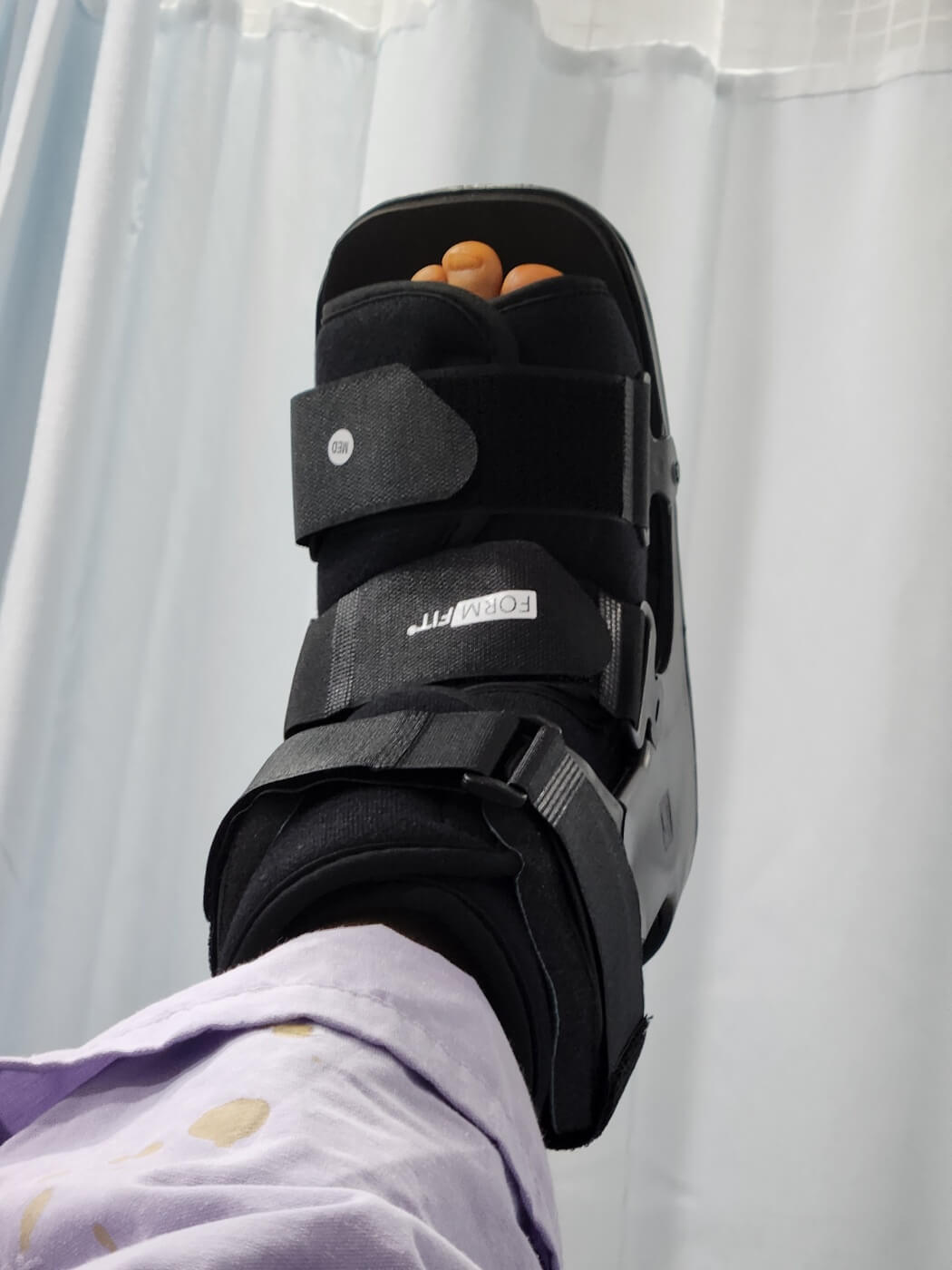 무지외반증 수술을 하면 양발에 깁스 같은 캠워커 같은 보조기구를 착용합니다. 캠워커를 착용 후에 뒤꿈치로 걷다 보니 화장실, 일상생활 하는 것에는 문제가 없습니다. 두발이 진행 때문에 고민이신 분들은 다시 한번 한 번에 끝내는 걸 추천해 드립니다.