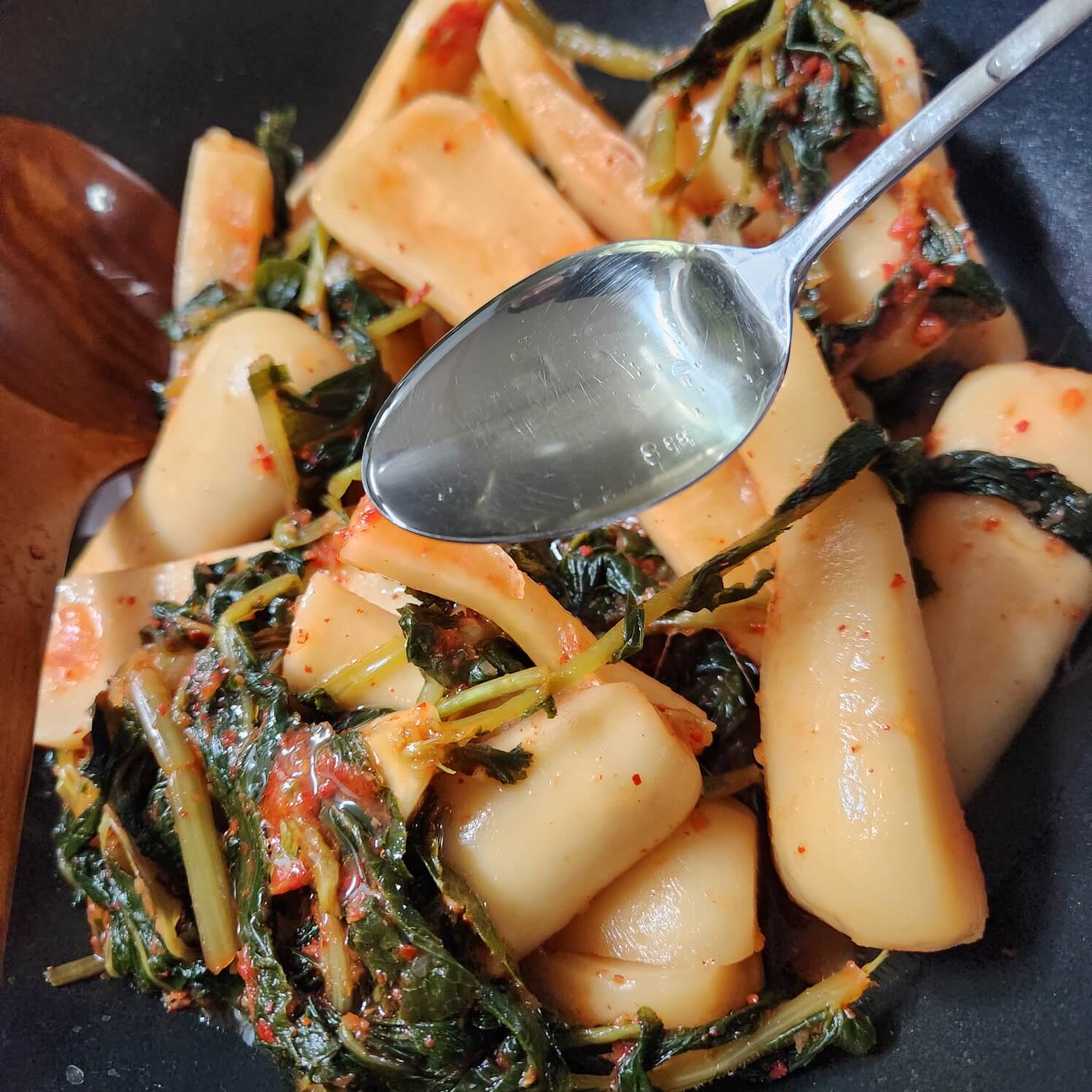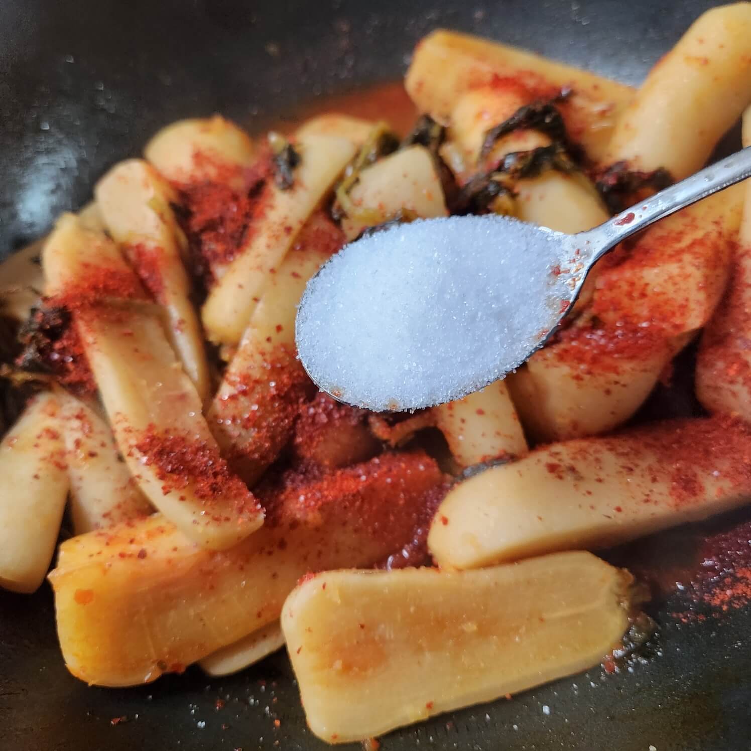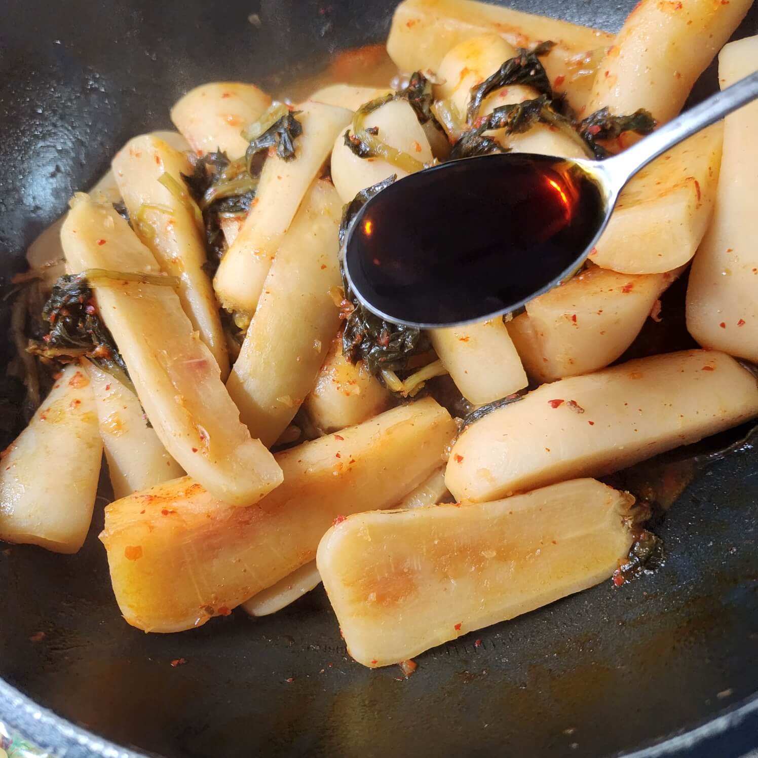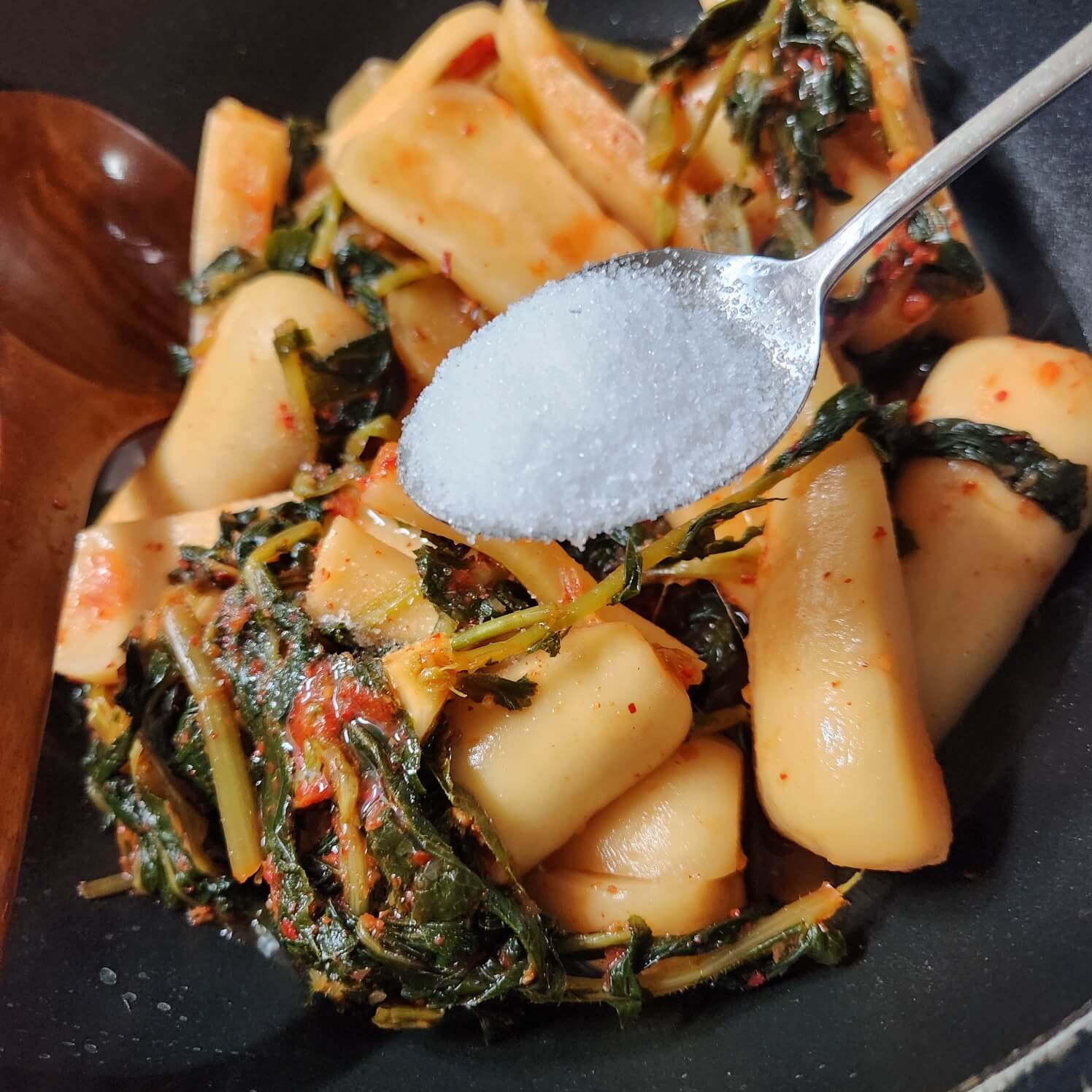 3. 설탕과 식용유가 알타리 김치에 코팅이 잘 되게 뒤집개로 여러 번 뒤집어 주면서 끓여준다. 👉 (센불 5분)