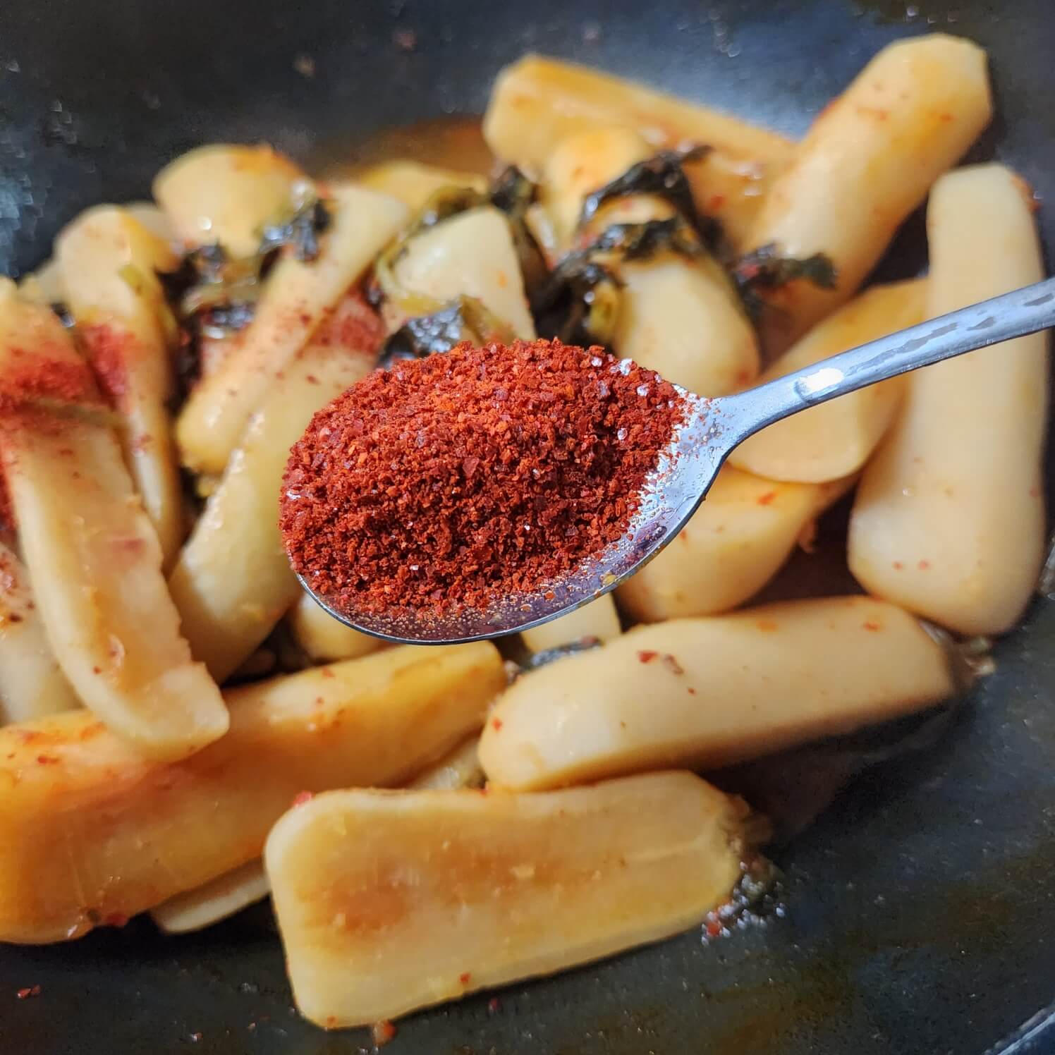 👉여기서 색깔이 너무 하얗게 되면 맛이 없게 되니 숟가락 기준으로 고춧가루 1을 넣어서 색을 더해 준다.