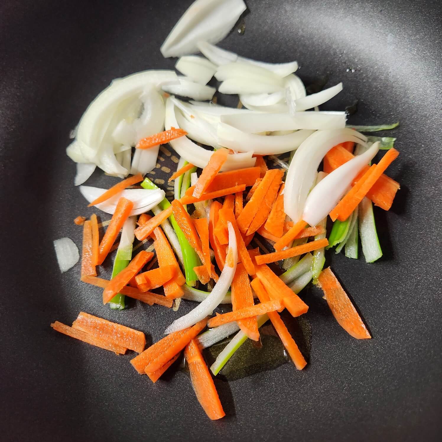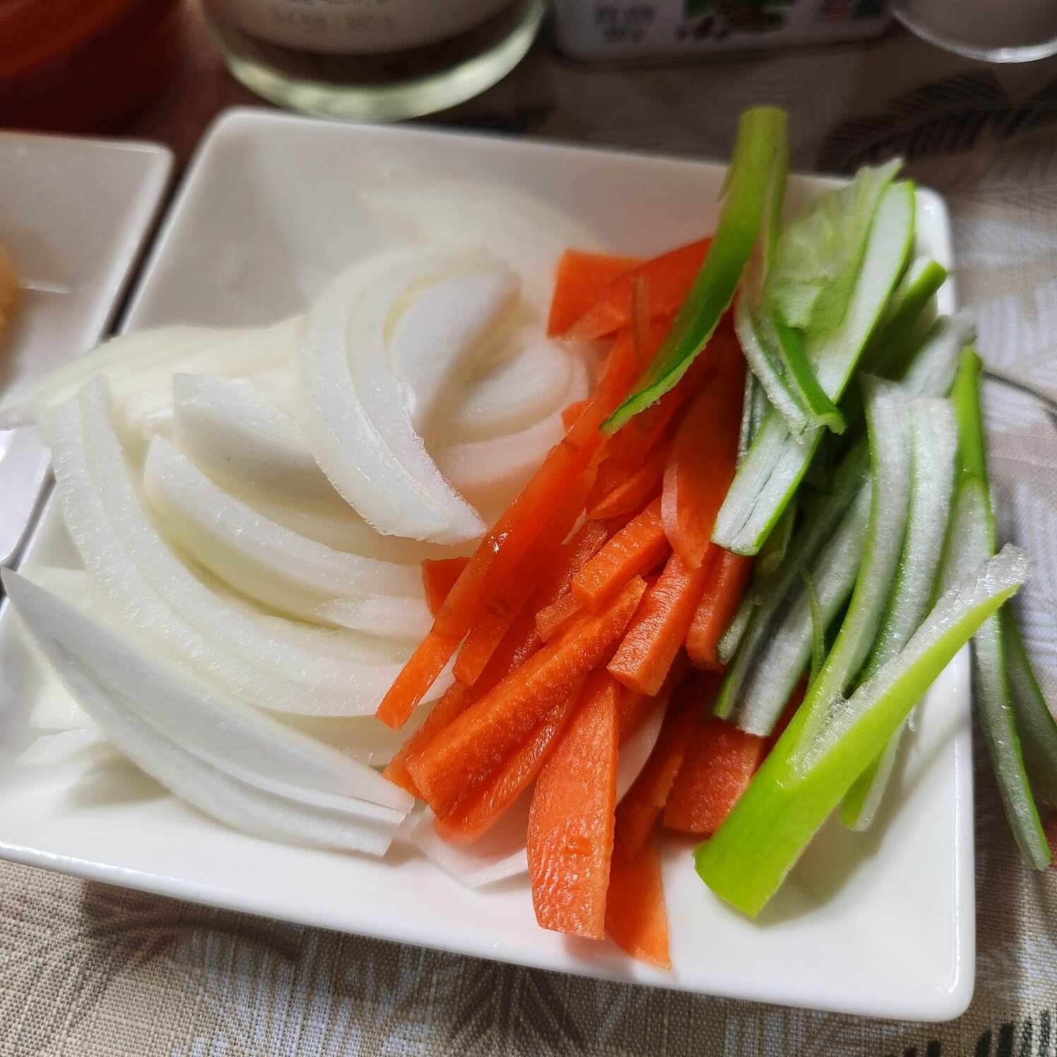2. 양파, 당근, 대파는 채썰어 주면 된다.