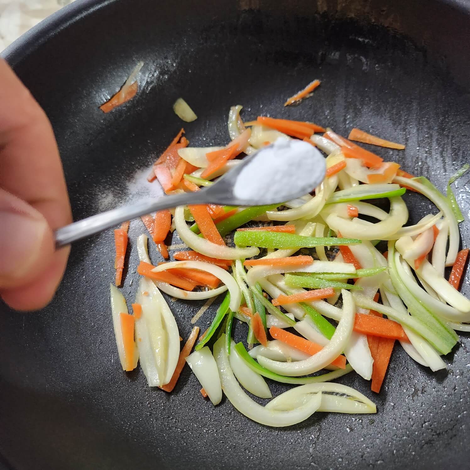 👉티스푼으로 소금 2개 넣고 볶아준다.