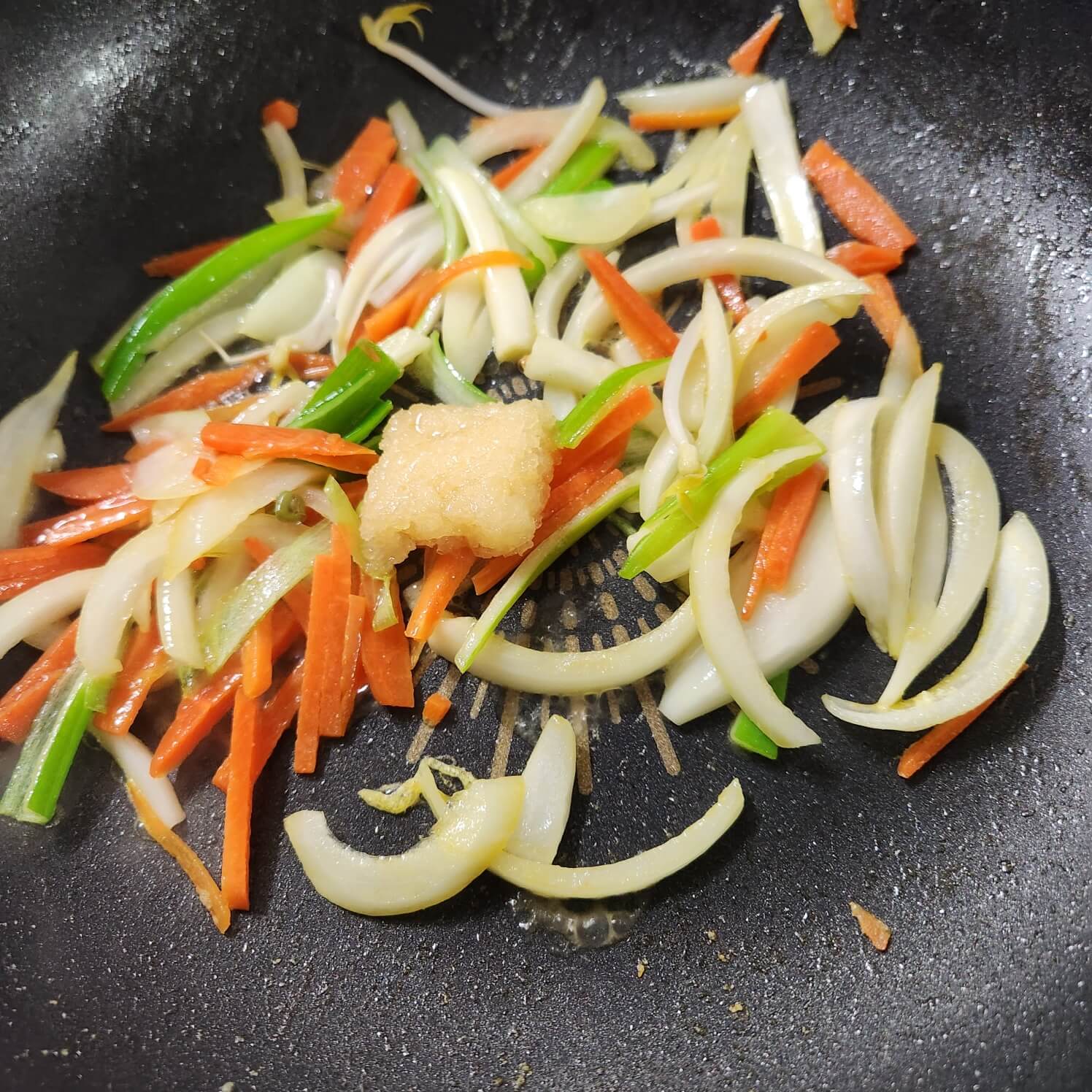 2. 센불로 1분 정도 야채를 볶고, 다진마늘 0.5 (16g) 숟가락을 넣고 볶아주다가 숙주를 넣고 볶아주면 된다.