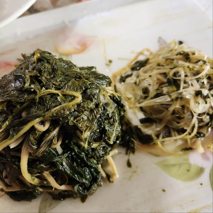 👉오른쪽 사진을 설명하지면 왼쪽은 시래기 투명 껍질을 제거 한 상태이고, 오른쪽은 시래기 투명한 껍질이 제거한 상태이다.