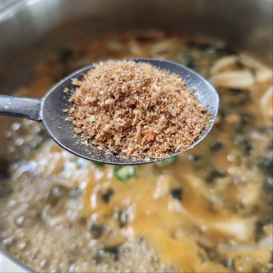 👉홍게액젓 1, 보리새우 가루 1을 넣고 약불로 5분 끓여주고, 드실 때 한번더 센불로 3분 ~ 5분 끓여주면 구수한 시래기 된장국이 완성된다.