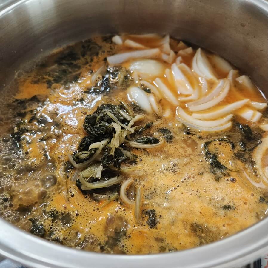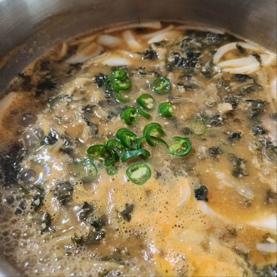 👉육수에 양파, 시래기, 다지마늘1, 청양고추를 넣고 센불로 3분정도 끓여주면 된다.