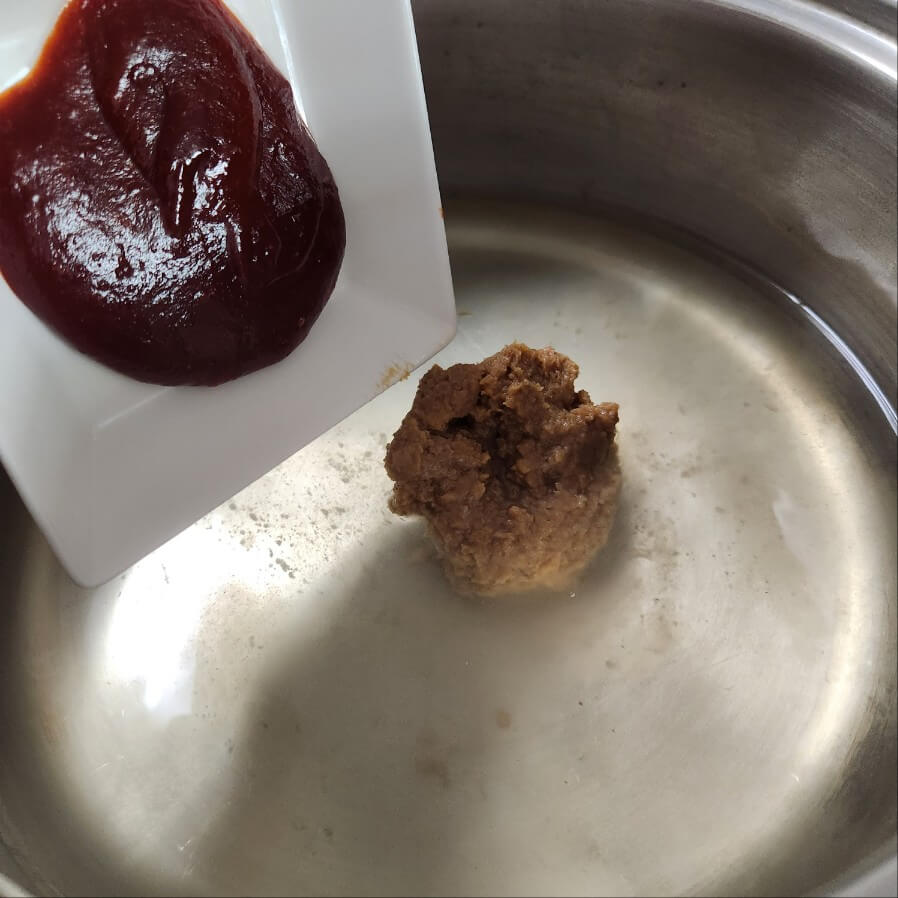 1. 냄비에 멸치 다시마 육수 800ml, 된장 1, 고추장 1을 넣고 센불로 끓여주면 된다.