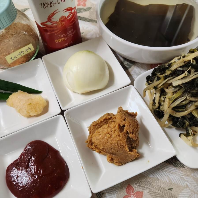 • 시래기 306g, 양파 반개, 다진마늘, 청양고추 1.5개, 된장, 고추장, 보리새우 가루, 홍게액젓, 멸치다시마육수