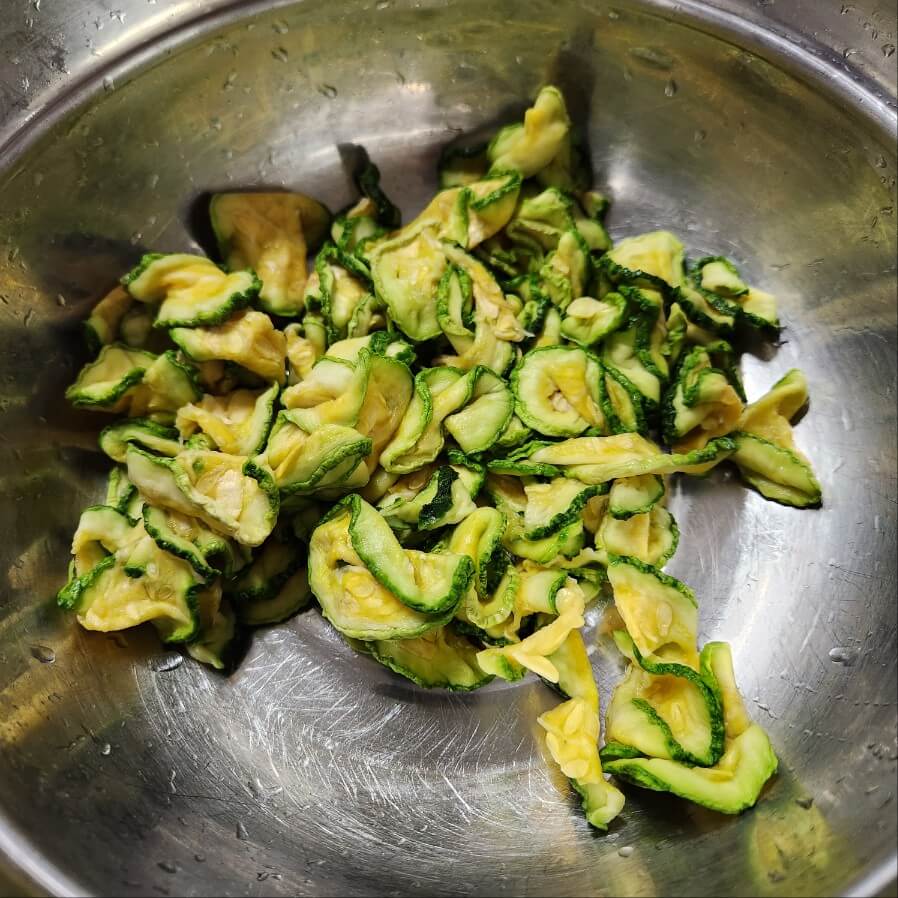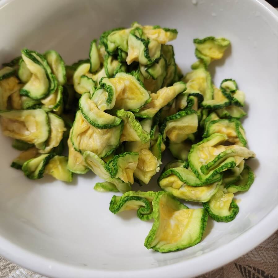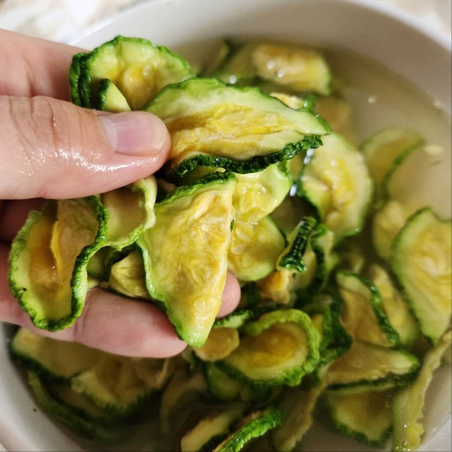 👉왼쪽 사진을 보면 알 수 있겠지만 건조되어서 바삭한데, 물에 30분 정도 담그면 부드럽고 쫄깃한 애호박을 바껴버린다.