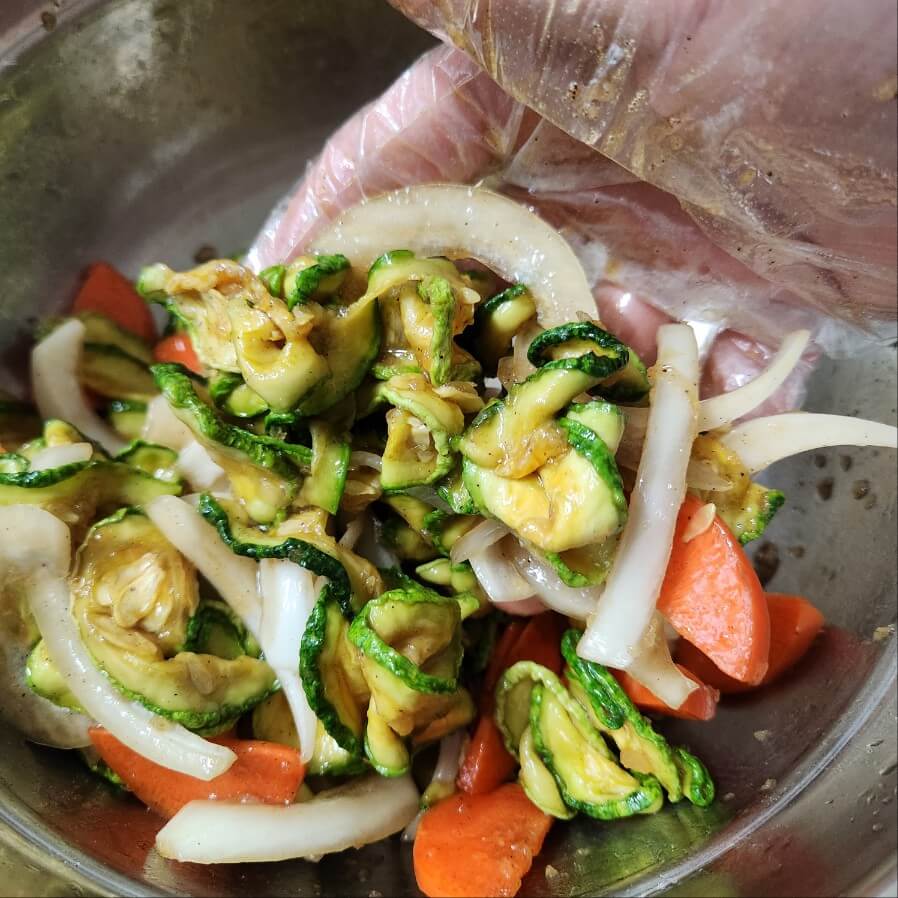 👉쎄게 주무르면 야채가 부숴지는 약하게 쪼물딱 해주면서 간을 베게 만져줍니다.