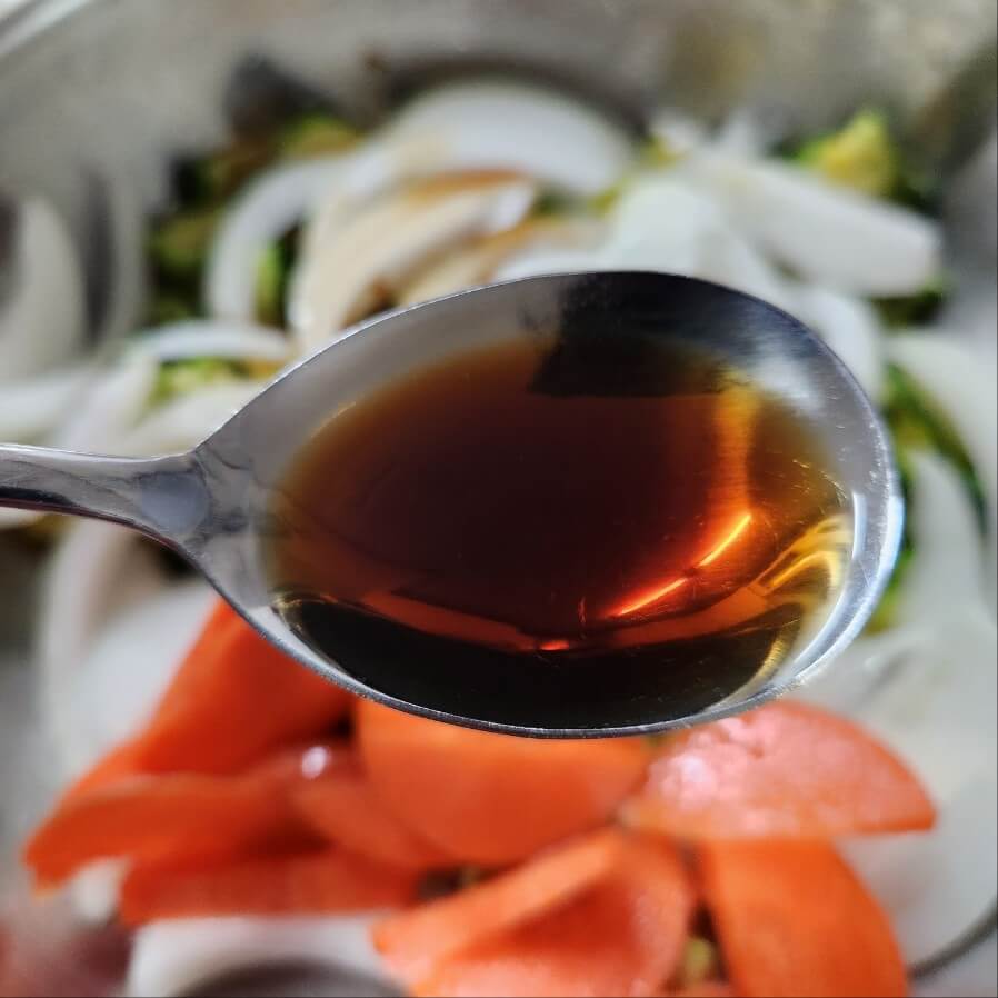 3. 숟가락 기준으로 간장 3, 홍게액 2.5, 들기름 2, 후추는 3번 털어서 넣어준다.
