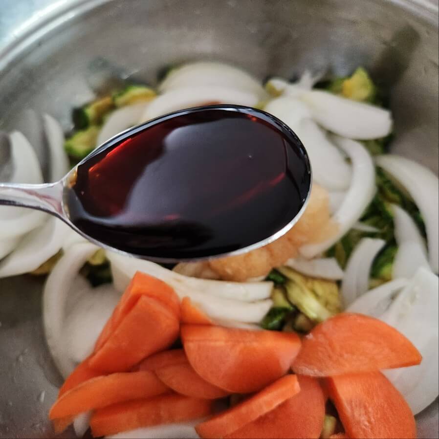 4. 오른쪽 사진처럼 양파색이 검정으로 물들게 한다면 대부분의 야채들이 간이 벤 상태이다.