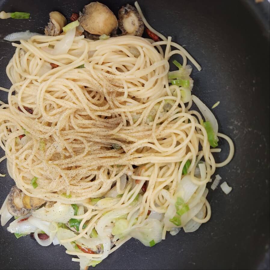 3. 이제는 센불로 아까 삶은 파스타 면을 넣고 취향 것 후추를 뿌려준다.