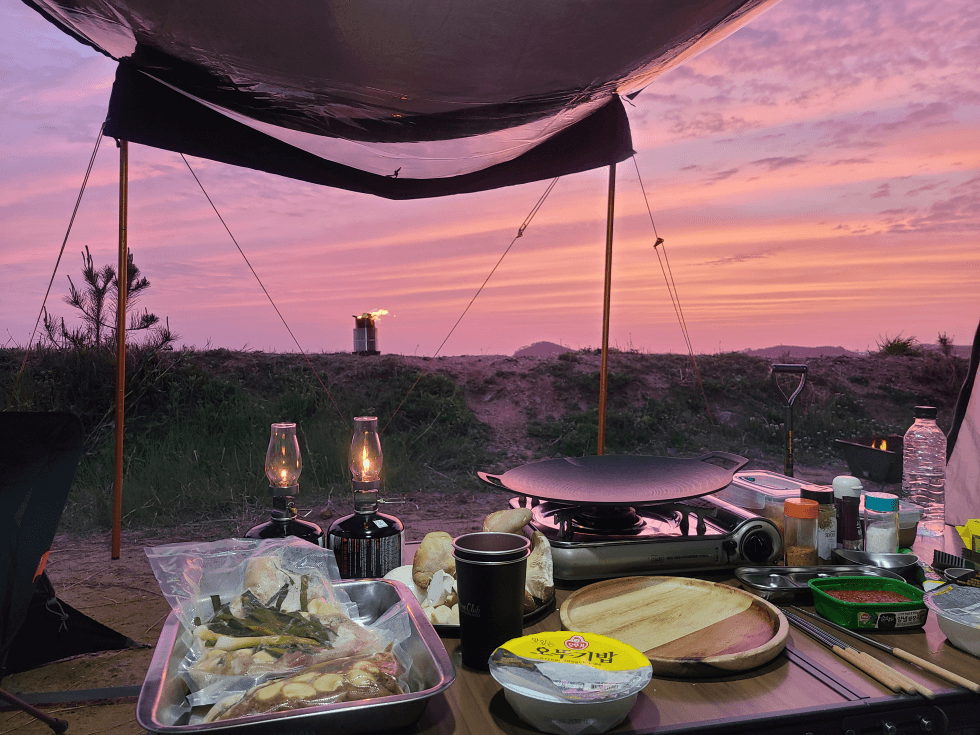 백사장 사계절 숲속 캠핑장 : 충남 태안군 안면읍 해안 관광로 927-48으로 가격은 대략 5만원 가역에서 사이트를 예약해서 갔다 왔던 거 같습니다. 화장실도 디지털 식이여서 냄새나 위생 상태가 전혀 문제가 없었습니다. 근데 다소 사장님이 방문자들은 호루라기로 불면서 따라다니는 모습을 보니 너무 정 없다고 느껴지기도 했습니다. 여기는 바닷가 근처라서 바람이 엄청 많이 불었는데 텐트를 피칭하다가 제 폴대가 이때 휘어졌습니다. 이런 경우는 또 처음이라 당황했지만 재밌었던 2박 3일 캠핑이었습니다. 바닷가 근처라 바닷바람이 솔솔 불어서 시원했지만, 갑자기 돌풍이 만이 불어서 폴대가 휘어지기도 했습니다. 다들 바람이 센 곳에서 텐트를 피칭하실 때는 항상 팩을 30cm로 이상 땅에 박고 시작해야지 텐트가 날아가는 것부터 시작해서 조금 더 안전하게 텐트를 피칭하실 수 있을 것 같습니다. (타프의 경우 메인 폴대 30cm 2개씩 박고 사이드 폴대에 15cm 박아주지만, 바람이 많이 부는 곳에는 40cm, 30cm 섞어서 박아주는 것이 좋을 것 같습니다.) 처음 이렇게 바람 많은 곳에서 피칭을 해서, 제 폴대는 제가 경험 미숙이라 휘어지고 결국 A/S를 받고 나왔던 기억이 있습니다. 안면도는 전체적으로 뷰 맛집 캠핑장입니다. 개인적으로 노을과 바다 너무 이뻐서 더 인상적이었던 거 같습니다. 그리고 캠핑의 꽃은 불멍과 바비큐라고 생각합니다. 활활 타오르는 불멍과 호롱불, 그리고 노을로 물든 하늘과 바다. 그리고 저를 기다리는 수비드 돼지고기 미디엄입니다.