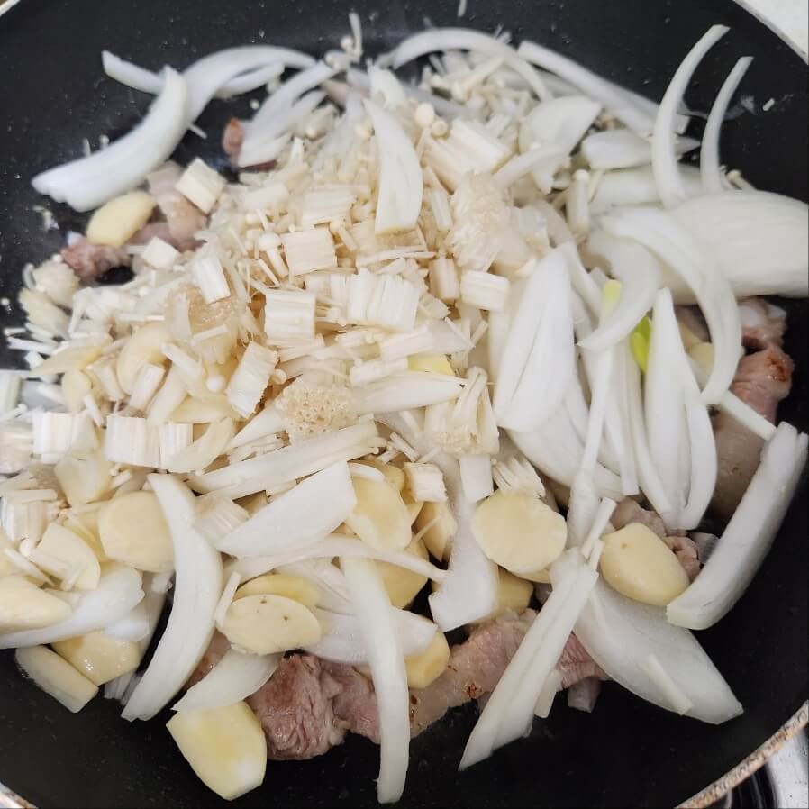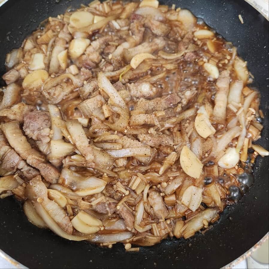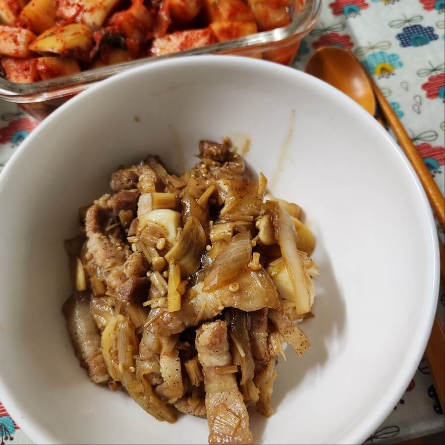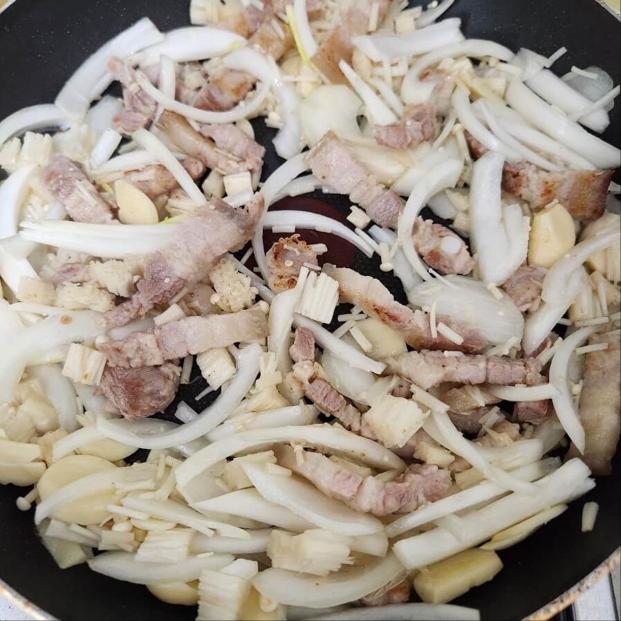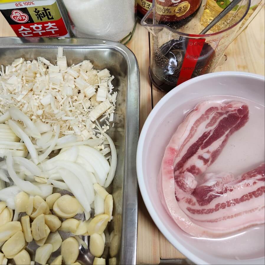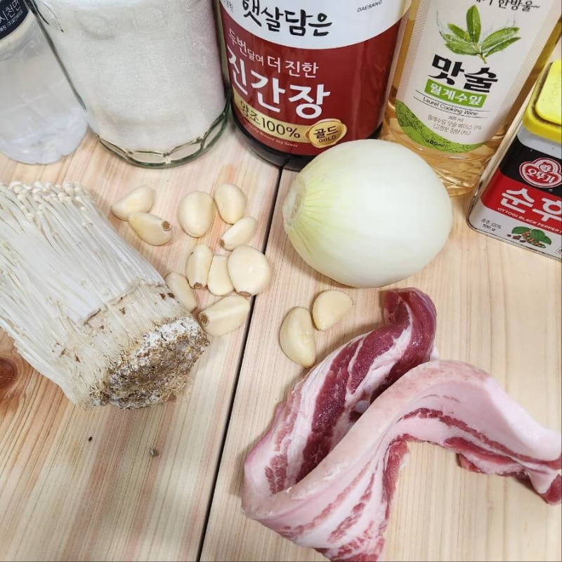 요리재료 : 물, 진간장, 맛술, 후추, 양파, 팽이버섯, 통마늘 12개, 설탕, 양파 1개, 팽이버섯 1개, 삼겹살 1줄