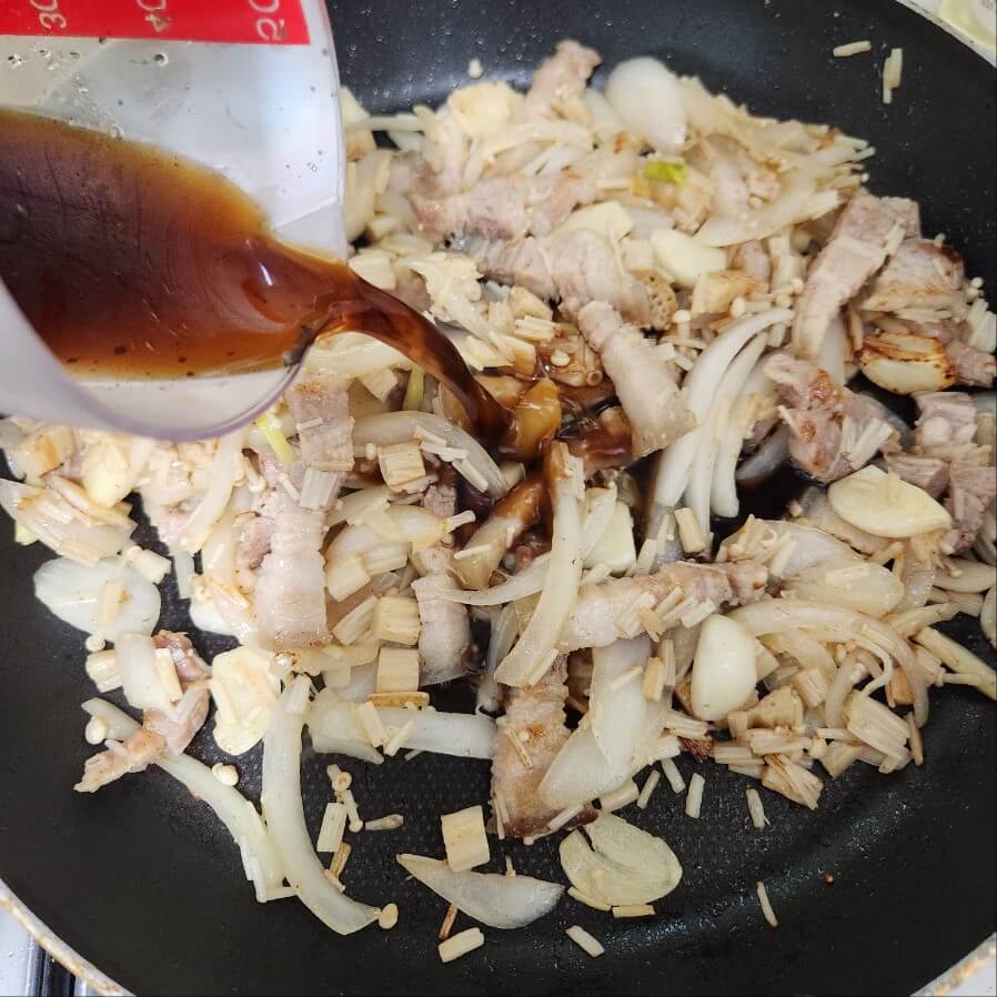 3. 삼겹살 덮밥 소준은 숟가락 기준으로 간장 7, 맛술 1, 설탕 3, 물 2, 후추 3번 털어 넣고 잘 섞어주면 된다.
