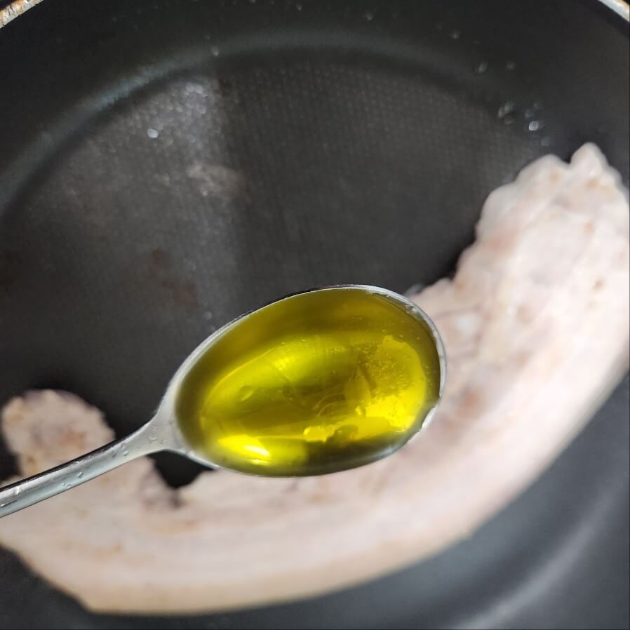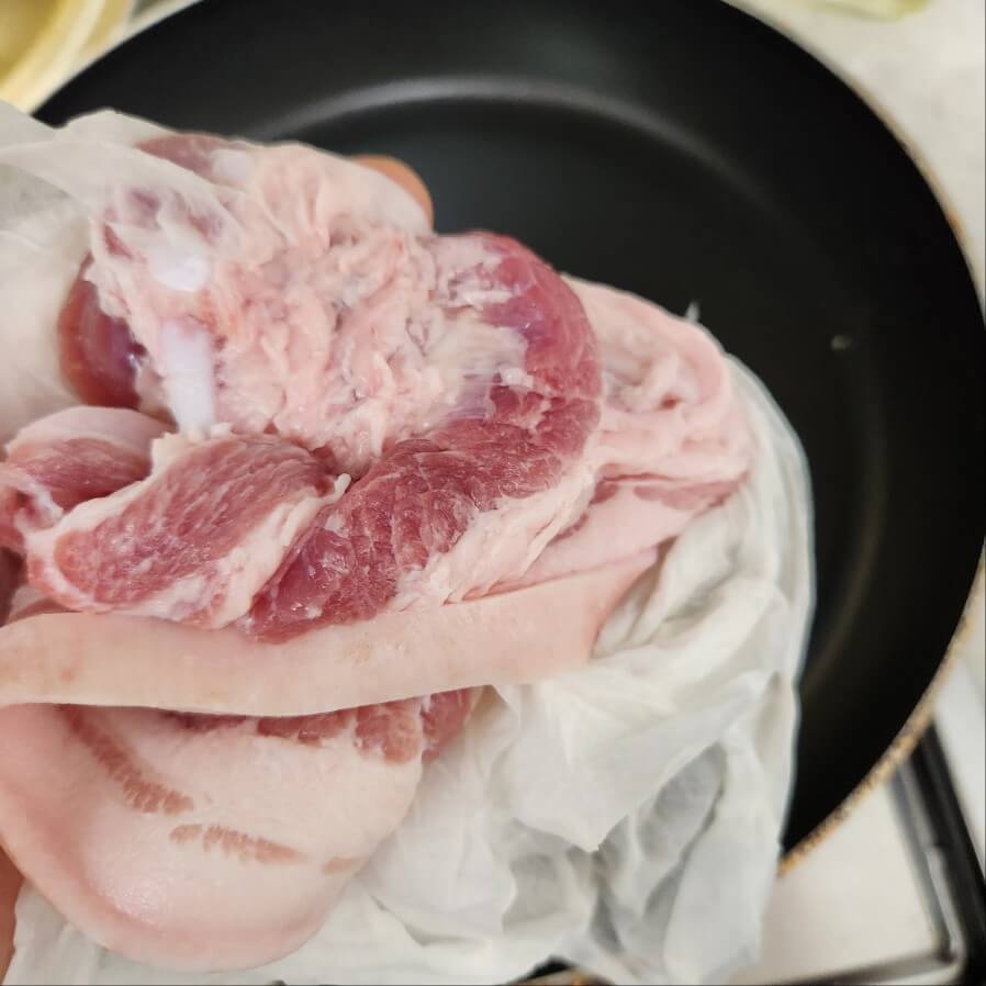 4. 삼겹살을 키친타올로 물기를 꼭 짠 다음에 팬에 구워주면 된다. 이때 중간불 2분 앞뒤로 구워 준 다음에 올리브유 1 숟가락을 넣었다.
