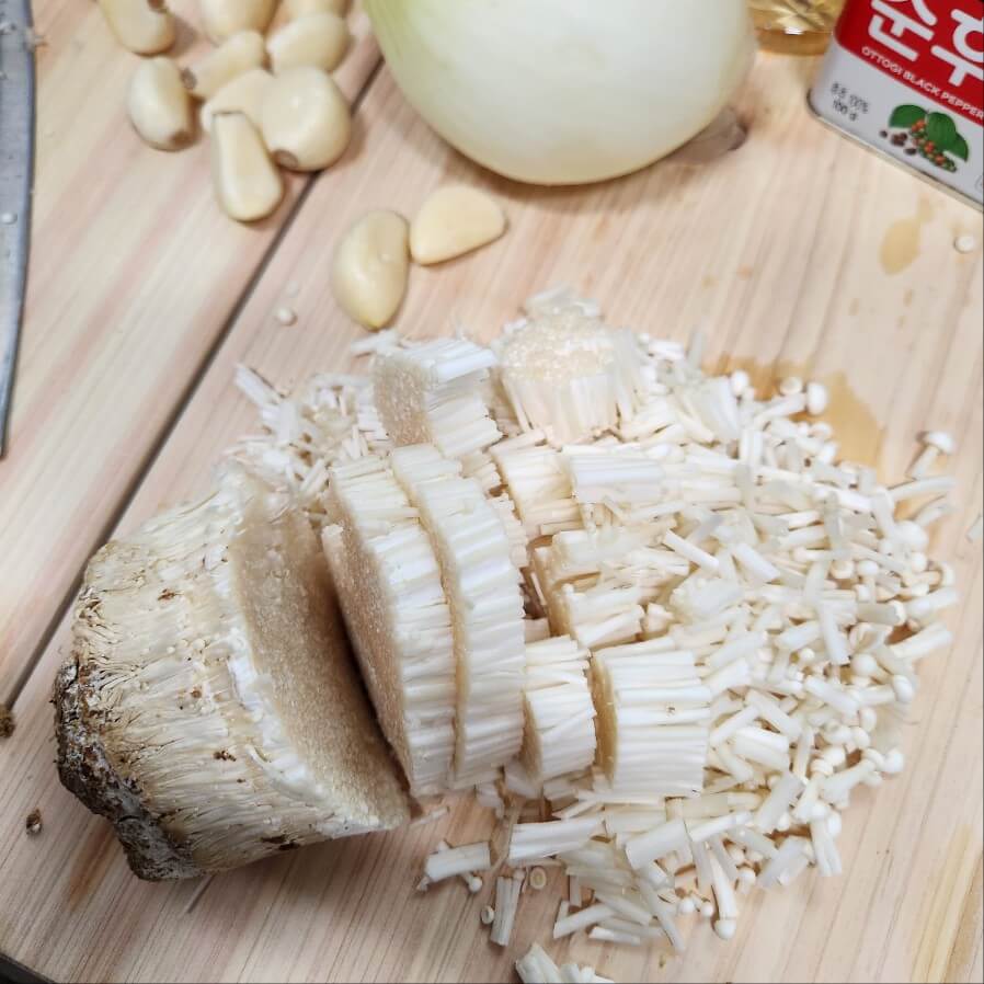 👉양파 채썰기, 통마늘 편썰기, 팽이버섯 밑동 잡고 얇게 썰어주면 된다.