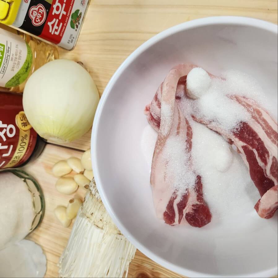 👉잡내를 가장 쉽게 잡는 방법은 바로 설탕에 재워주면된다. 삼겹살 1줄에 설탕을 2 숟가락 넣어주고, 물은 삼겹살이 잠길 때까지만 부어주면 된다.