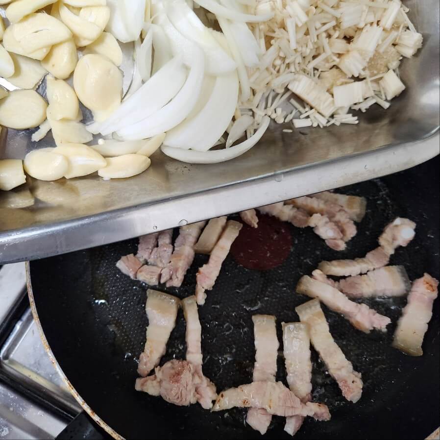 5. 이제 삼겹살 기름에 팽이버섯, 통마늘, 야파를 넣고 센 불로 3분 ~ 4분 볶아주면 된다. 뒤집개가 있으면 요리조리 섞어주시면 되고, 웍질이 가능하시면 웍질로 야채와 삼겹살을 빠르게 볶아주면 좋다.