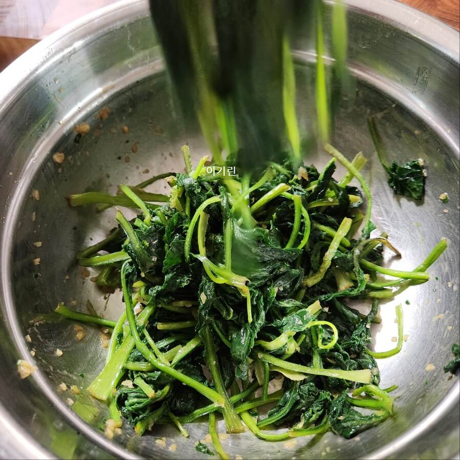 👉나물 무침은 볼에서 무치고, 나물 무침을 들어 위에서 털어주면서 아래에서 다시 뭉쳐주고 반복하면 골고루 양념이 잘 배인다.