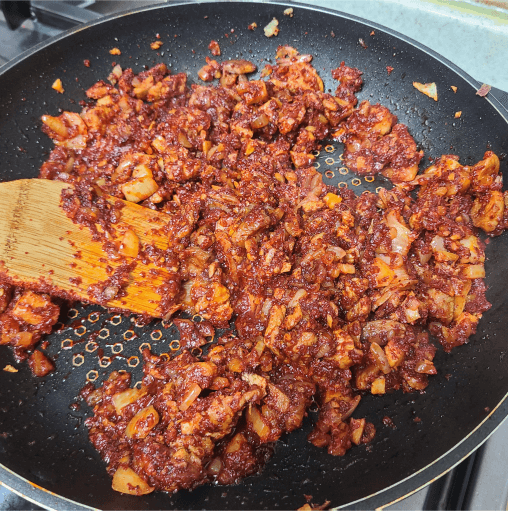 요리를 하다 보면 전과 후를 비교하게 되는데요. 전과 비교했을 때 수분이 날아가서 차이를 느끼시나요? 위 사진처럼 이렇게 수분이 없어지도록 볶아주시면 됩니다. (이때 너무 팬에 오래 있으면 탈 수도 있으니 계속 저어 주셔야 됩니다.) 이제 다 만드신 양념장은 투명한 용기나, 깨끗한 용기에 보관해주셔서 필요하실 때마다 양념으로 활용하시면 됩니다.