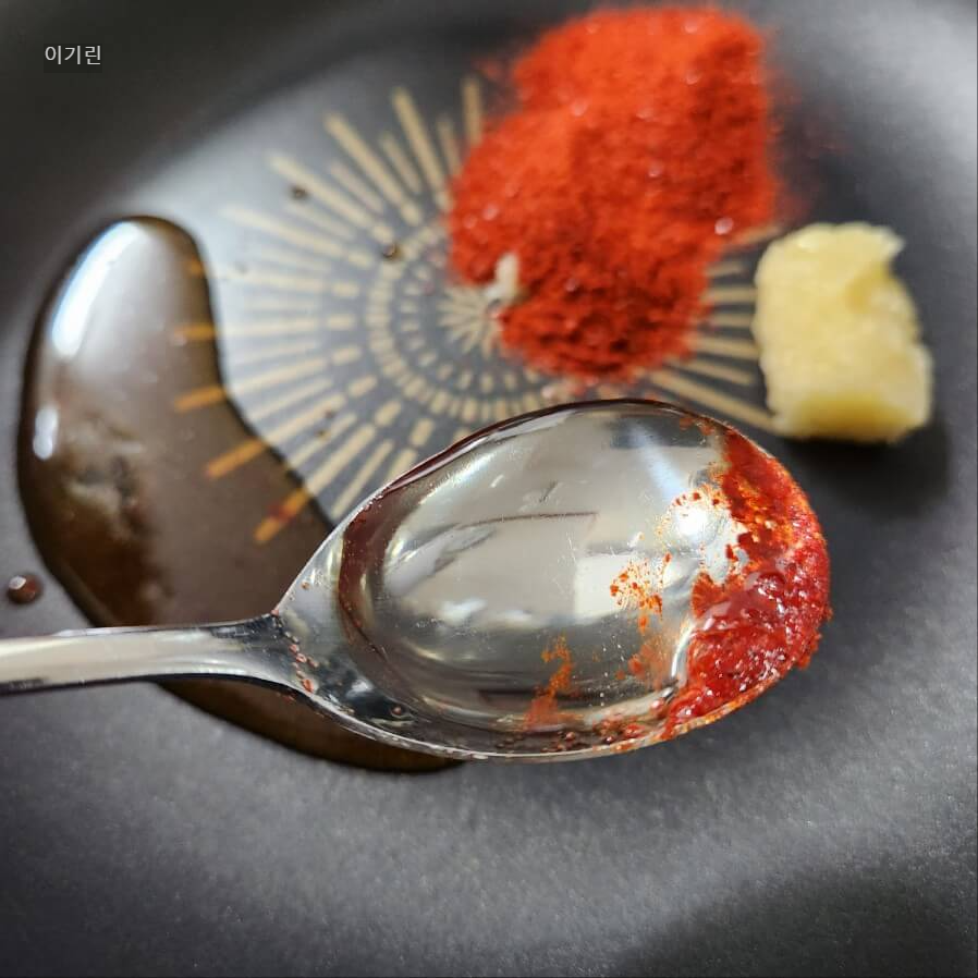 - 숟가락기준 전분가루 1, 고춧가루 2, 들기름 2, 매실액 1, 올리고당 1, 진간장 3, 다진마늘 1 ( 16g)