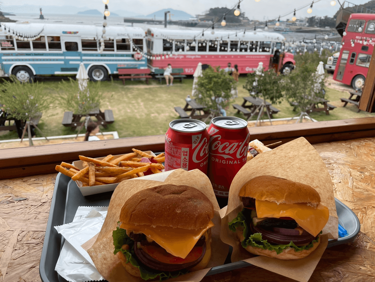 버스를 개조해서 이쁜 감성카페 느낌의 카페이지만, 2층에서 내려다보는 모습 또한 너무 이뻤습니다. 꼬마전구들이 대롱대롱 매달려 있는 불빛, 저기 멀리서 보이는 바다, 아이들이 뛰노는 모습들 나들이하기 좋은 날씨인 거 같았습니다. 햄버거 자체는 대략적으로 부드러웠고, 안에 야채들이 꽉 차 있어 식감이 좋았고, 패티 자체도 부드러운 고기 패티여서 좋았습니다. 여기서 식사를 나누시는 분들도 다소 많이 있었고, 혼자 와서 멍 때리면서 햄버거 드시는 분들, 아이들과 함께 나들이 와서 쉬시는 부모님들, 연인들 다양한 사람들이 많았습니다.