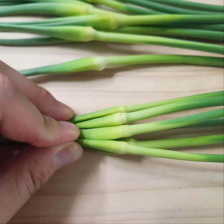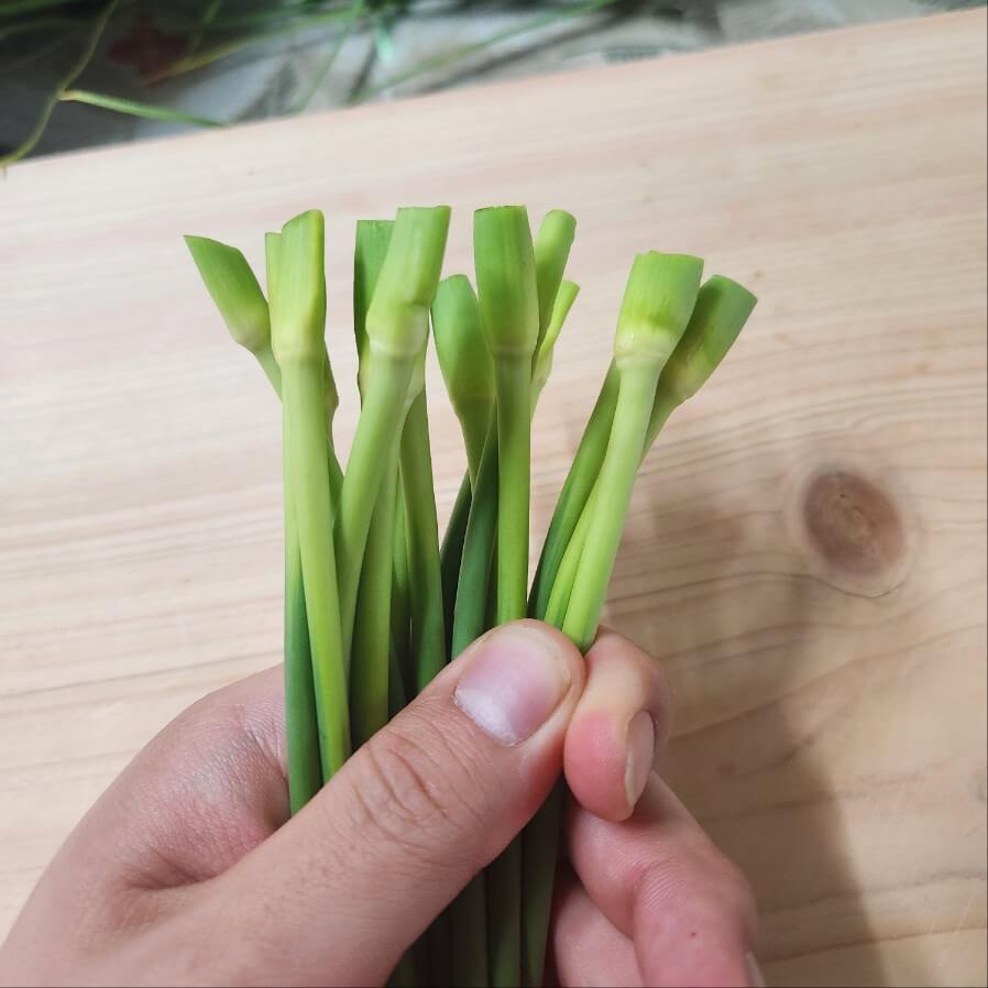 1. 마늘쫑은 위 손가락에 올린 부분을 칼로 잘라주고, 줄기 부분은 먹고, 잎 부분은 버려주면 된다.