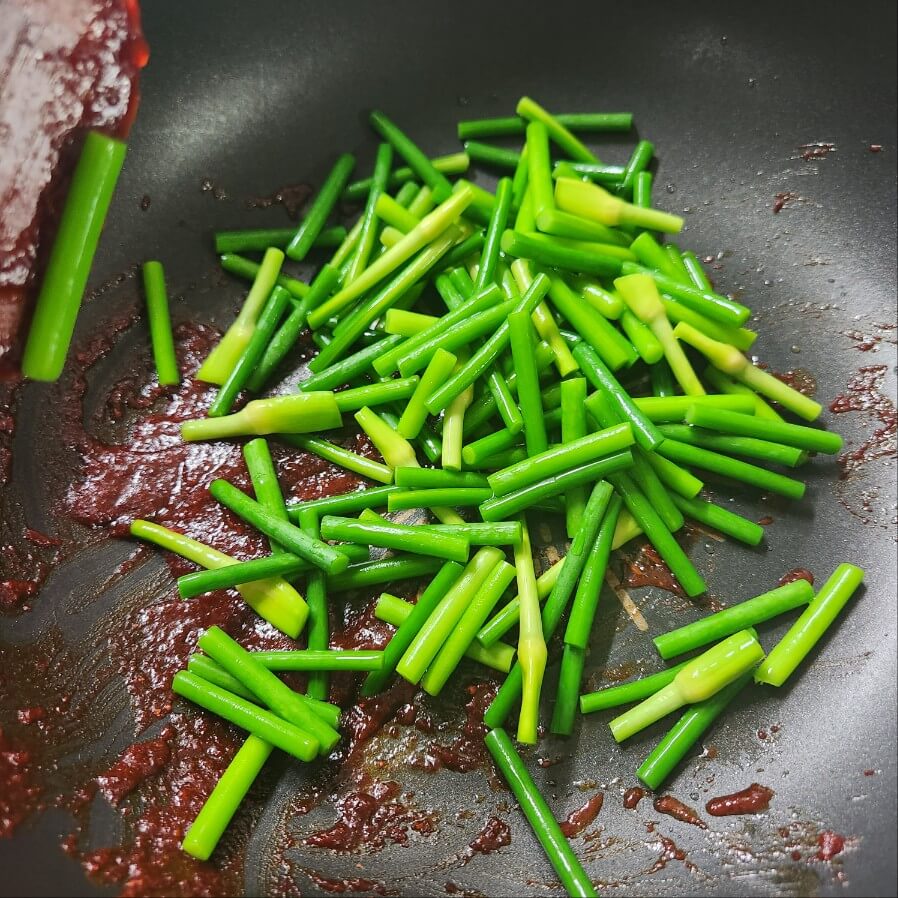 5. 물기를 제거한 마늘종을 1분 동안 중간불로 볶아주면서 양념을 배게 만들어 주면 된다.