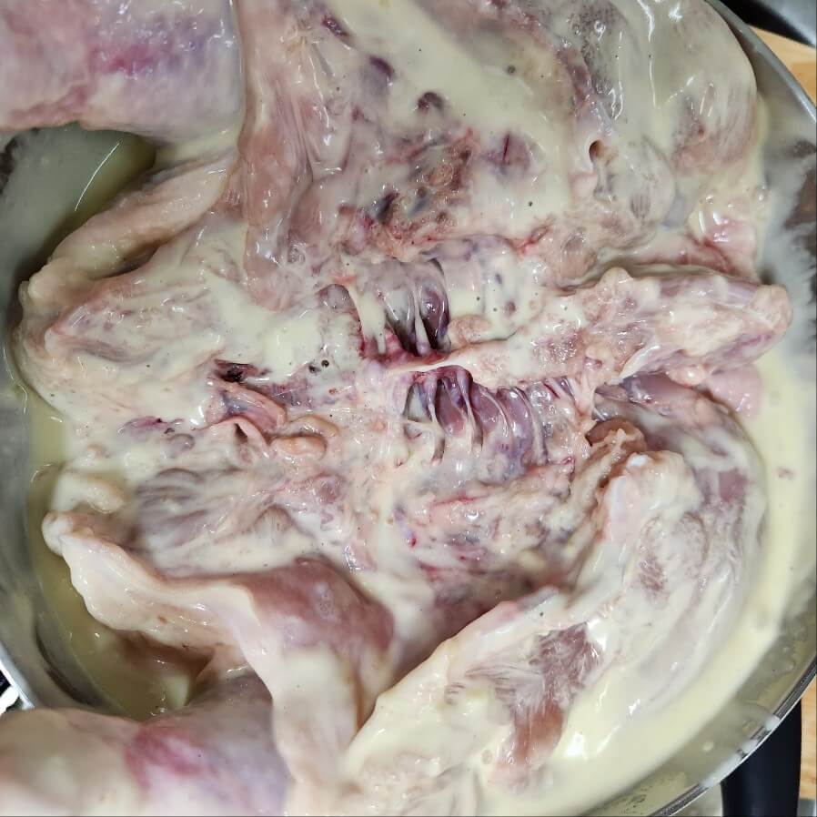 2. 반으로 자른 생닭을 흐르는 물에 씻어서 생닭의 이물질을 제거하고, 맥주로 담가서 핏물 제거와 연육작용, 잡내를 제거해 주면 된다.