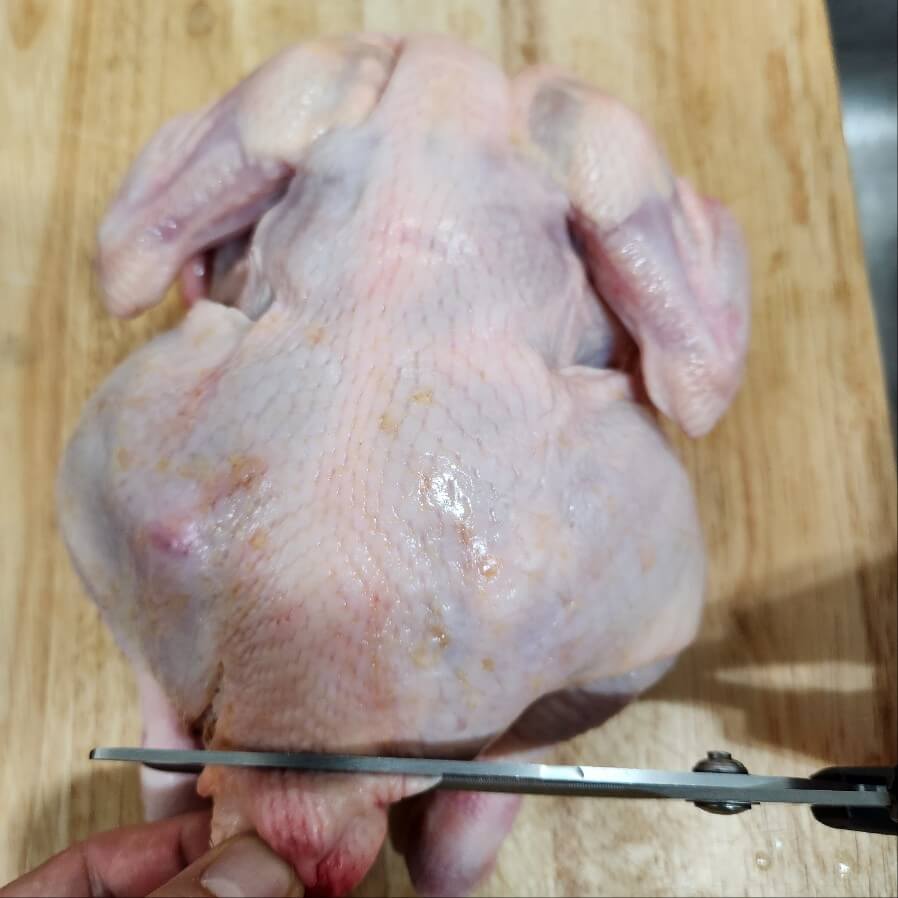 ✅닭의 꽁지 주변을 모두 잘라주면 된다. 닭 꽁지 와 주변 지방을 모두 가위로 자르고, 생닭은 가위로 반으로 잘라주면 된다.