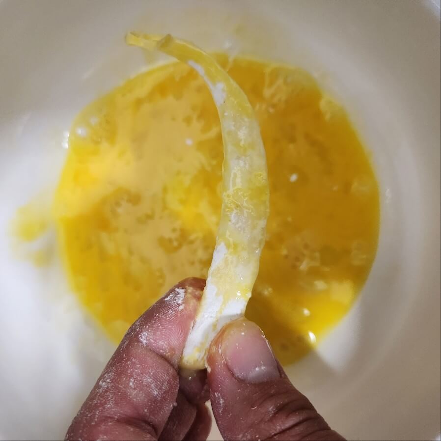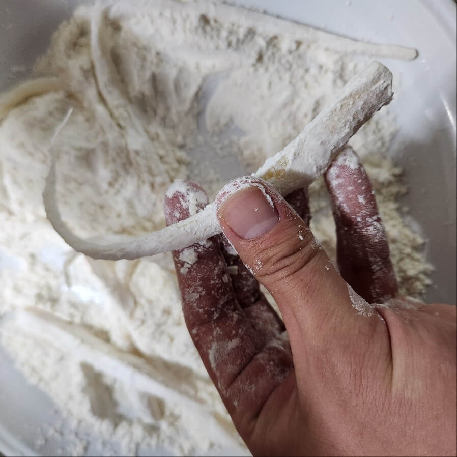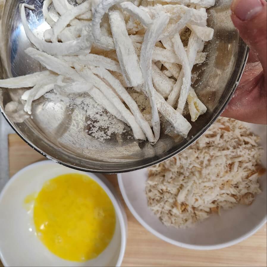✅ 튀김옷을 만들 때 넓은 쟁반, 그릇 위에 재료를 묻히고나서 그릇에 옮기면 좋다.