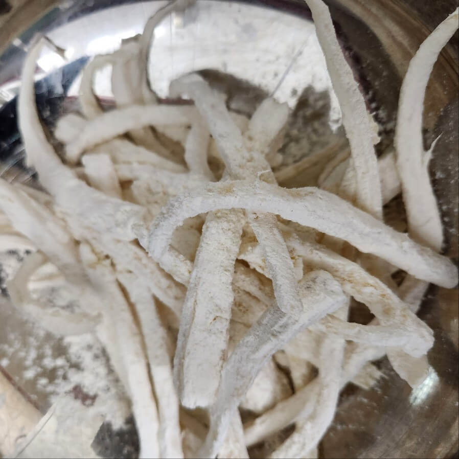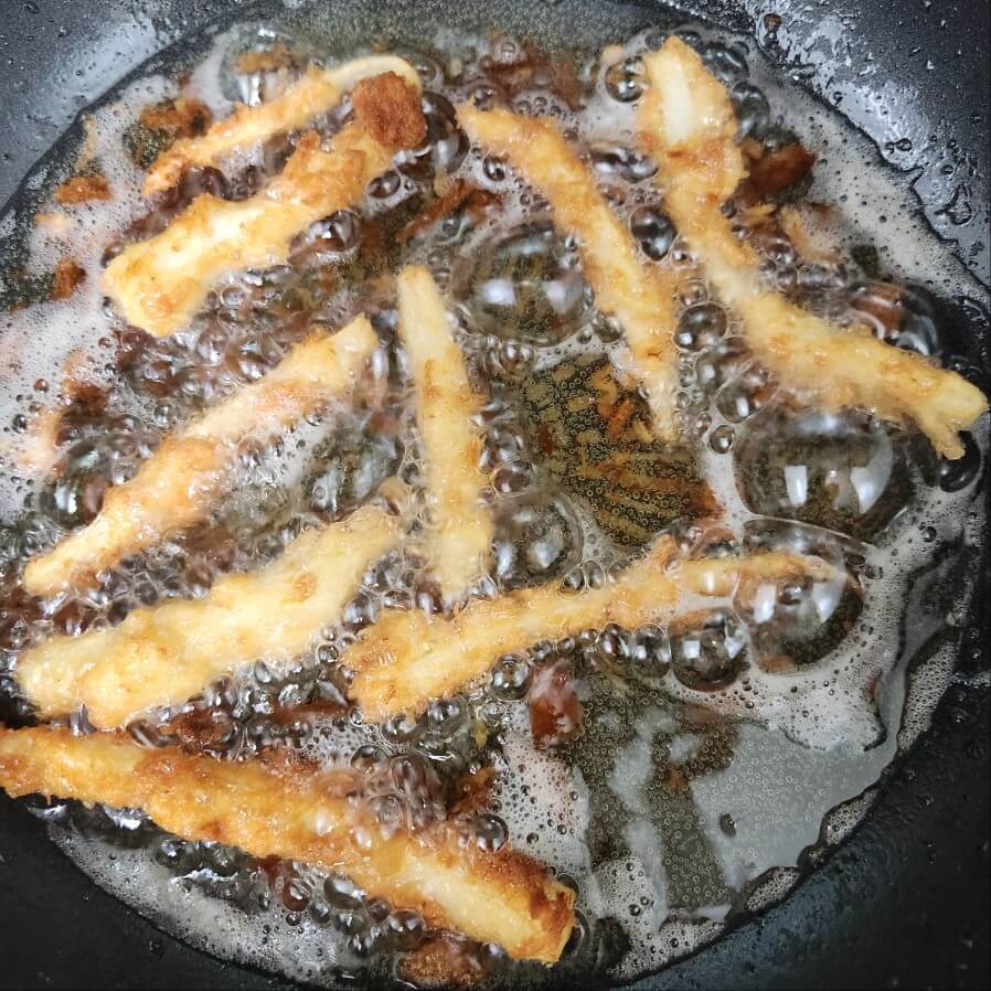 ✅ 이때 가장 중요한 점은 도라지에 전부 튀김가루가 묻어야 된다.