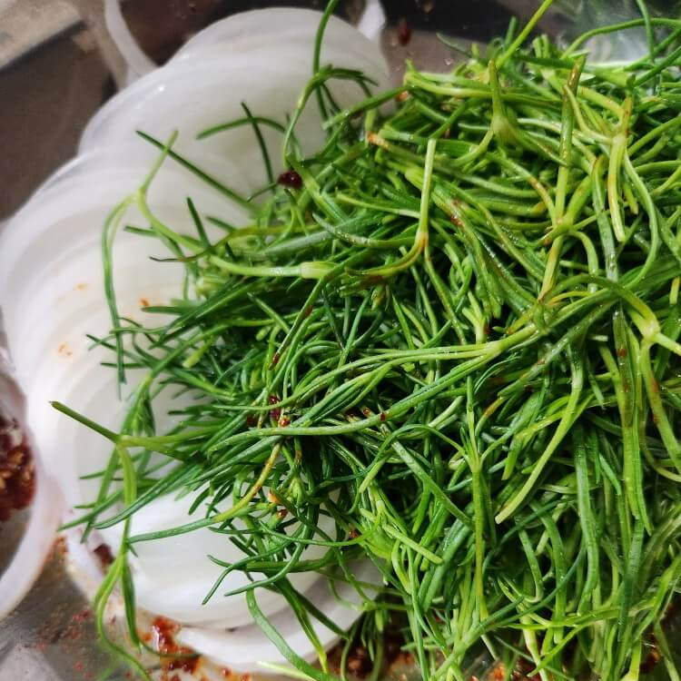 - 새발나물 소량 65g, 양파 반개, 매실액, 식초, 홍게액, 고춧가루, 설탕, 다진마늘, 들기름