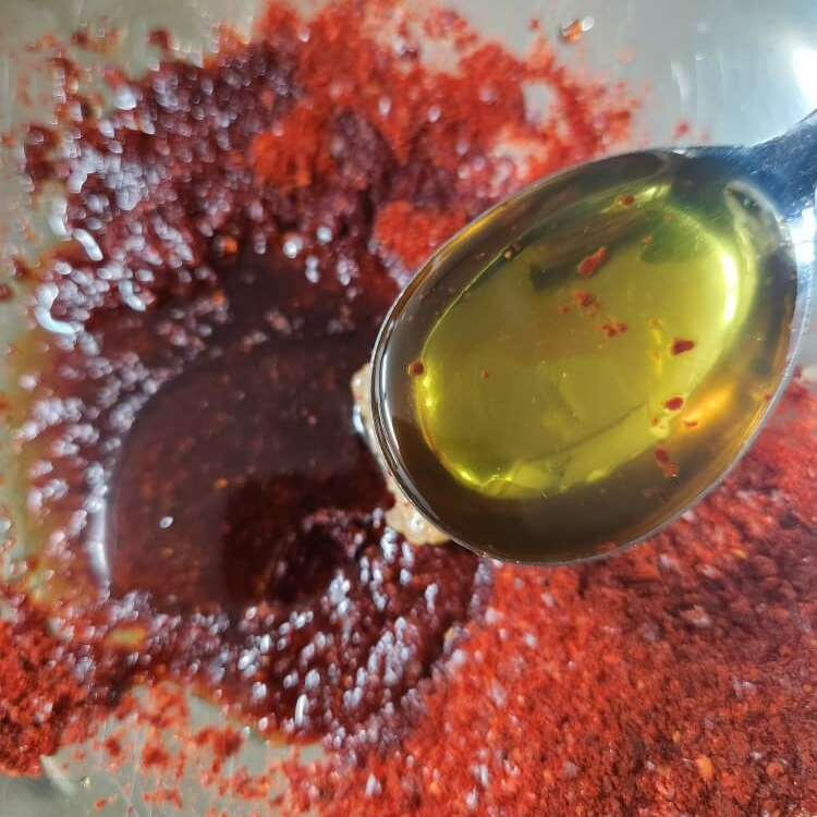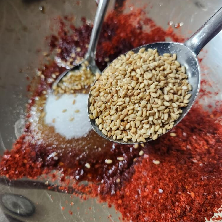 - 숟가락 기준으로 매실액 1, 식초 0.5, 홍게액 3, 고춧가루 2, 설탕 1, 다진마늘 0.5, 들기름 1